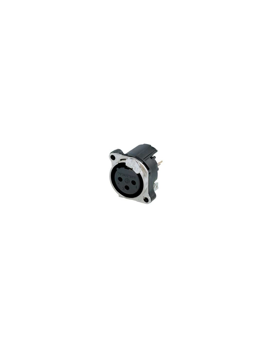 Conector de chasis XLR hembra de 3 pines. Serie B. Color: níquel, contactos en oro. Montaje vertical en PCB. Conexión a tierra: Pin 1 conectado directamente al panel frontal y a la carcasa del conector, sin contacto a tierra independiente. Receptáculos XLR más pequeños, mayor densidad de empaquetado. Diseño de contacto tipo Tulipán con alta presión de contacto para una durabilidad máxima. Brida de montaje metálica que ofrece un contacto de tierra circunferencial continuo con el chasis para una mejor protección EMC y RF. Sistema de pestillo de empuje asimétrico que permite un ahorro de espacio. Materiales: inserto de poliamida, carcasa de zinc. Especificaciones ambientales: inflamabilidad UL 94 V-0, norma IEC 61076-2-103, protección IP 40, rango de temperatura -30 °C a +80 °C.