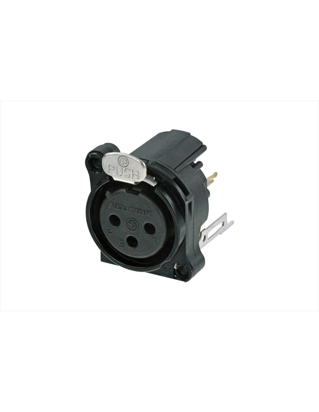 Conector de chasis XLR hembra de 3 pines. Serie B. Color: cromo negro, contactos en oro. Montaje vertical en PCB. Conexión a tierra: contacto de tierra separado conectado a la carcasa del conector y al panel frontal, sin conexión al pin 1. Receptáculos XLR más pequeños, mayor densidad de empaquetado. Diseño de contacto tipo Tulipán con alta presión de contacto para una durabilidad máxima. Brida de montaje metálica que ofrece un contacto de tierra circunferencial continuo con el chasis para una mejor protección EMC y RF. Pestillo de bloqueo de acero Ck67. Materiales: inserto de poliamida, carcasa de zinc. Especificaciones ambientales: inflamabilidad UL 94 V-0, norma IEC 61076-2-103, protección IP 40, rango de temperatura -30 °C a +80 °C.