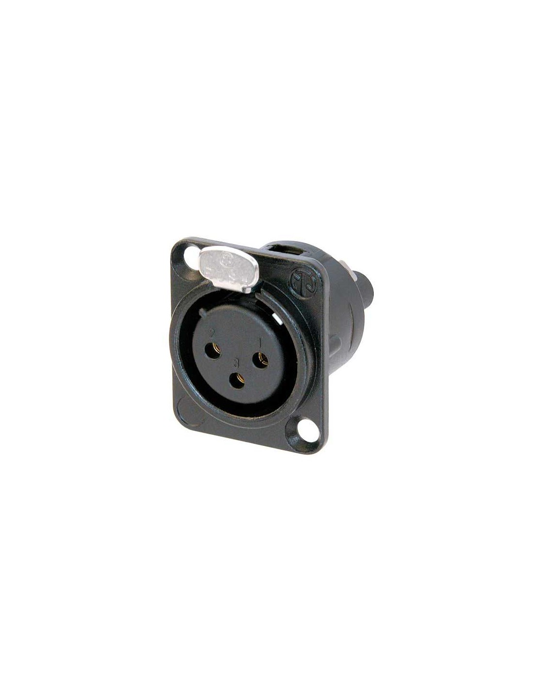 Conector de chasis XLR hembra de 3 pines. Serie D. Color: negro, contactos en oro. Serie universal XLR de montaje en panel, con cuerpo metálico de tamaño D. Dispositivo de bloqueo mediante cerradura de pestillo. Terminales de tornillo que admiten cables de 0,14 mm² a 0,5 mm² (AWG 26 -20). Materiales: carcasa de zinc. Especificaciones ambientales: inflamabilidad UL 94 V-0, norma IEC 61076-2-103, protección IP 40, rango de temperatura -30 °C a +80 °C.