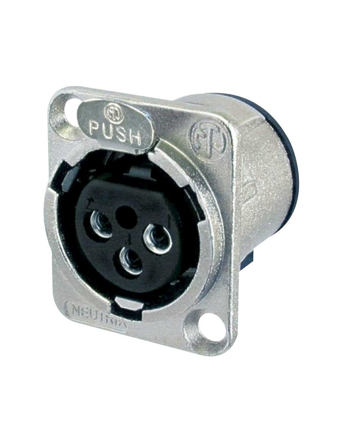 Conector de chasis XLR hembra de 3 pines. Serie D. Color: níquel, contactos en plata. Ideal para montaje vertical en PCB. Cuerpo metálico de tamaño D. Inserto removible de la carcasa para facilitar el ensamblaje. Óptima protección RF mediante 3 contactos de apantallamiento. Dispositivo de bloqueo mediante cerradura de pestillo. Materiales: carcasa de zinc. Especificaciones ambientales: inflamabilidad UL 94 V-0, norma IEC 61076-2-103, protección IP 40, rango de temperatura -30 °C a +80 °C.