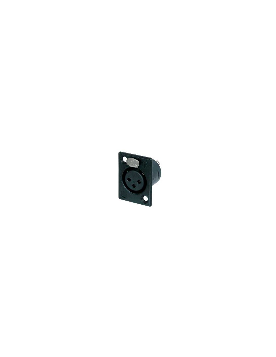 Conector de chasis XLR hembra de 3 pines. Serie P. Color: negro, contactos en oro. Conector pequeño para montaje en panel metálico, con grandes copas de soldadura para facilitar el cableado. Receptáculo hembra corto. Especificaciones mecánicas: contactos de soldadura, dispositivo de bloqueo mediante cerradura de pestillo. Materiales: carcasa de zinc. Especificaciones ambientales: inflamabilidad UL 94 HB, norma IEC 61076-2-103, protección IP 40, rango de temperatura -30 °C a +80 °C.