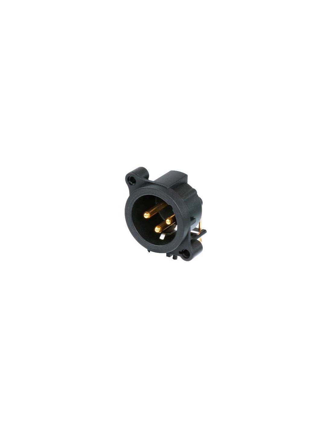 Conector de chasis XLR macho de 3 pines. Serie AA. Color: negro, contactos en oro. Montaje horizontal en PCB. Cuerpo redondo de plástico más rentable. Contacto de tierra conectado a la masa de la carcasa, pero no al chasis ni al pin 1. Diseño de contacto tipo Tulipán con alta presión de contacto para una durabilidad máxima. Recorte del panel frontal y diseño de PCB 100% compatible con la serie A. Dispositivo de bloqueo mediante cerradura de pestillo. Materiales: carcasa de poliamida. Especificaciones ambientales: inflamabilidad UL 94 HB, norma IEC 61076-2-103, protección IP 40, rango de temperatura -30 °C a +80 °C.