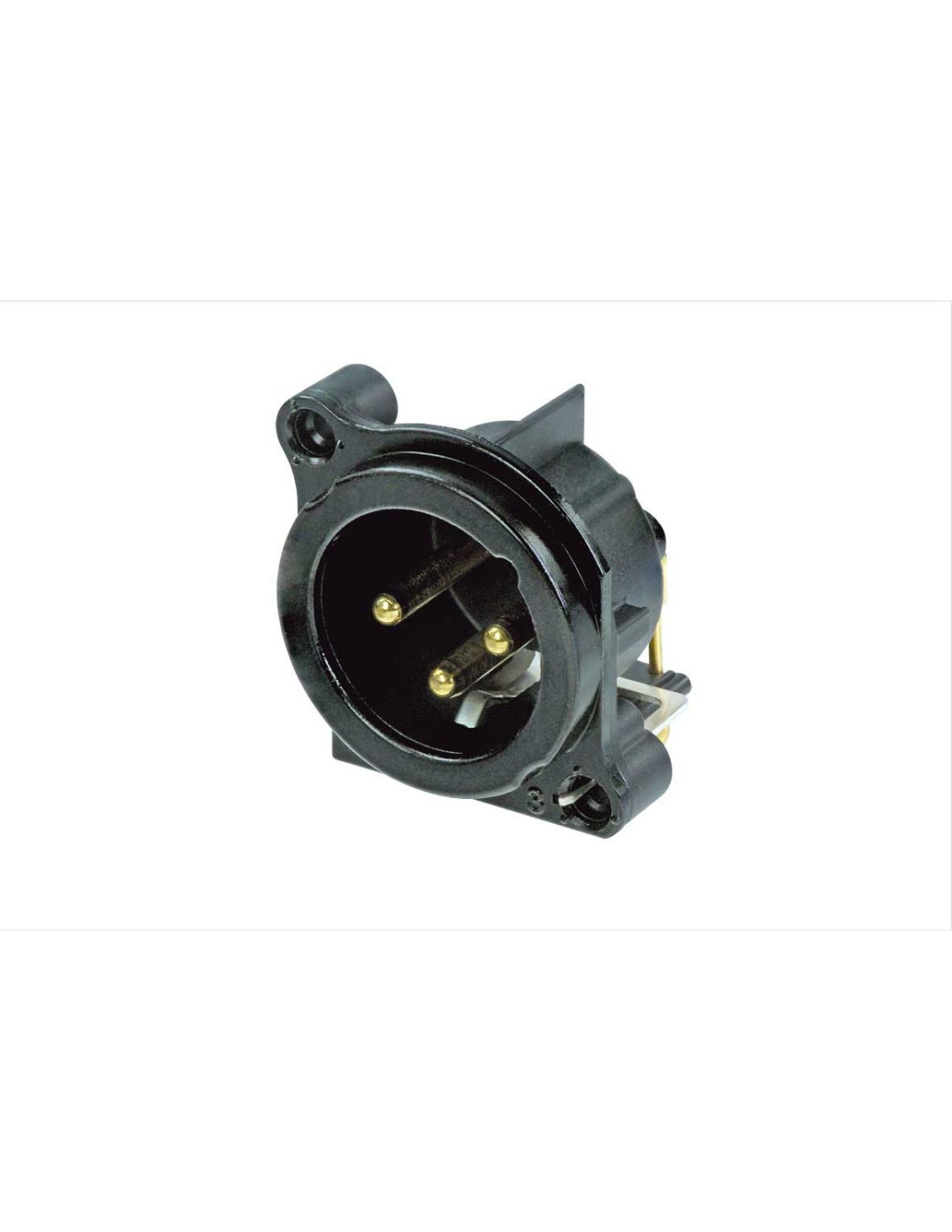 Conector de chasis XLR macho de 3 pines. Serie B. Color: negro, contactos en oro. Montaje horizontal en PCB. Brida de montaje de metal con contacto de tierra circunferencial continuo con el chasis para una mejor protección EMC y RF. Lengüeta de retención de acero. Contacto de masa separado conectado a la carcasa del conector y al panel frontal, sin conexión al pin 1. Receptáculo XLR más pequeño, mayor densidad de empaquetado. Dispositivo de bloqueo mediante cerradura de pestillo. Materiales: carcasa de zinc. Especificaciones ambientales: inflamabilidad UL 94 V-0, norma IEC 61076-2 103, protección IP 40, rango de temperatura -30 °C a +80 °C. °C.