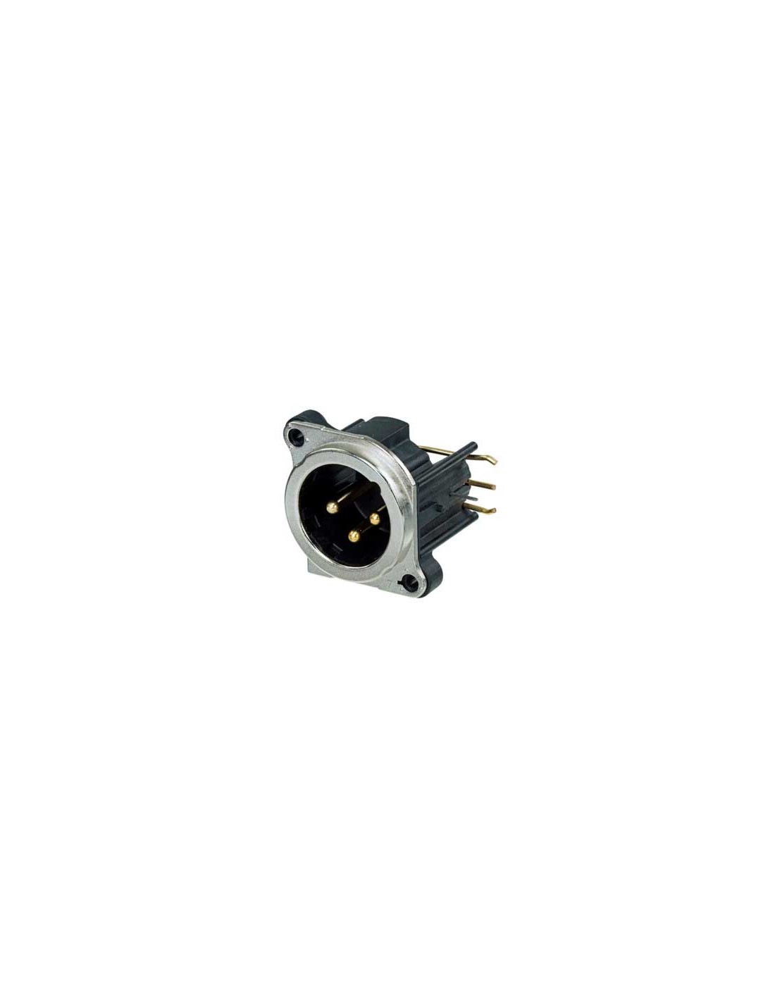 Conector de chasis XLR macho de 3 pines. Serie B. Color: níquel, contactos en oro. Montaje lateral derecho en PCB. Brida de montaje de metal con contacto de tierra circunferencial continuo con el chasis para una mejor protección EMC y RF. Lengüeta de retención de acero. Contacto de masa separado conectado a la carcasa del conector y al panel frontal, sin conexión al pin 1. Receptáculo XLR más pequeño, mayor densidad de empaquetado. Dispositivo de bloqueo mediante cerradura de pestillo. Materiales: carcasa de zinc. Especificaciones ambientales: inflamabilidad UL 94 V-0, norma IEC 61076-2 103, protección IP 40, rango de temperatura -30 °C a +80 °C.