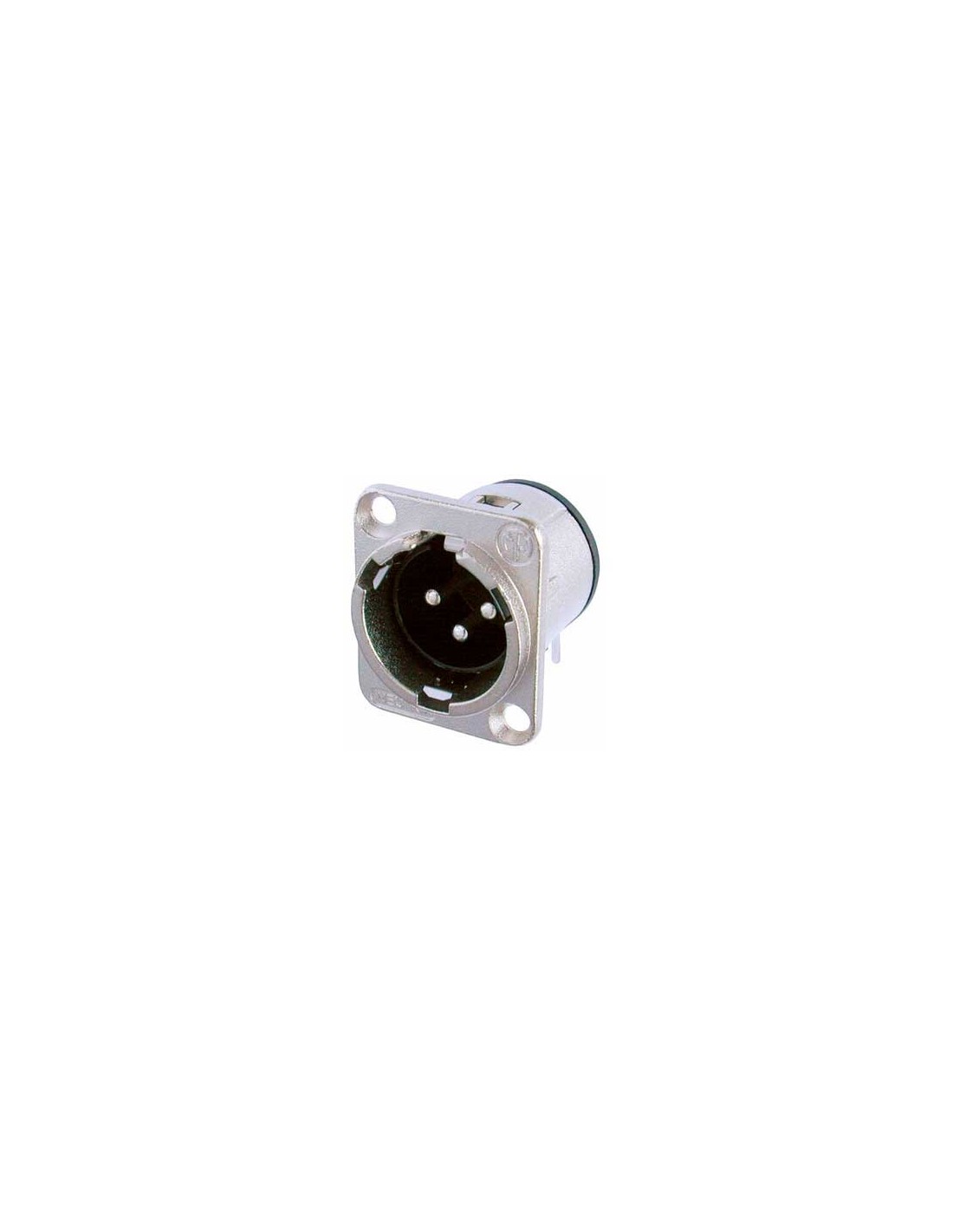 Conector de chasis XLR macho de 3 pines. Serie D. Color: níquel, contactos en plata. Montaje horizontal en PCB. Serie de receptáculos XLR universales para montaje en panel con cuerpo metálico de tamaño D para aplicaciones de montaje en placa PCB. El inserto se puede extraer de la carcasa para facilitar el montaje. Óptima protección RF mediante 3 contactos de apantallamiento. Sistema de bloqueo mediante cerradura de pestillo. Materiales: carcasa de zinc, inserto de poliamida. Especificaciones ambientales: inflamabilidad UL 94 V-0, norma IEC 61076-2-103, protección IP 40, rango de temperatura -30 °C a +80 °C.