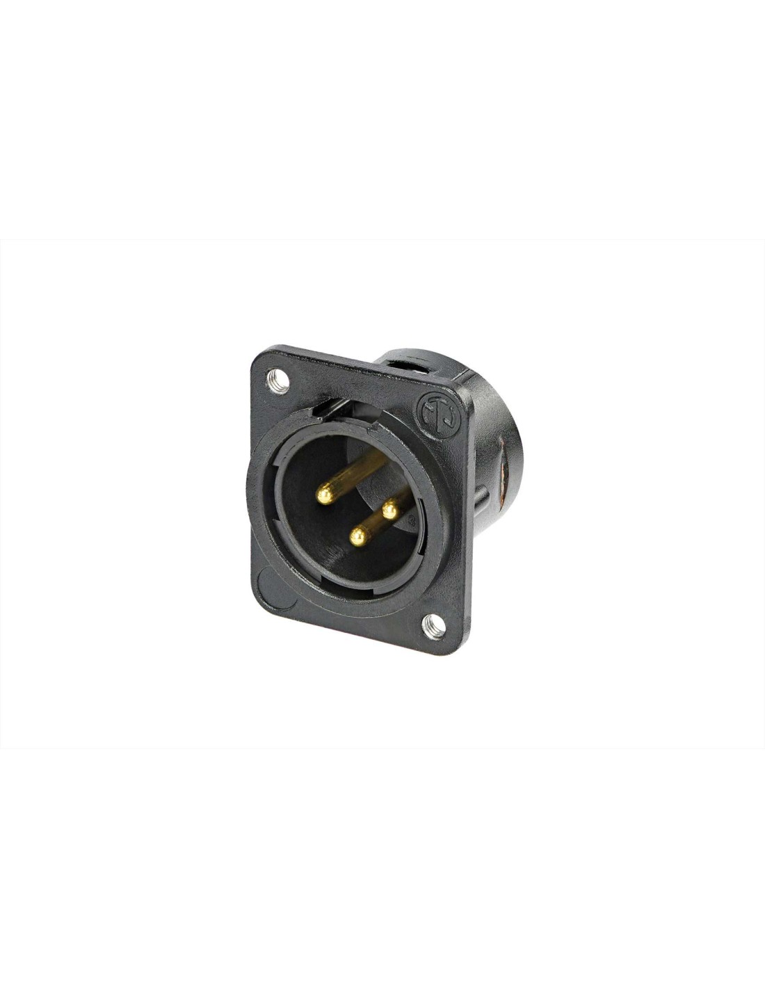 Conector de chasis XLR macho de 3 pines. Serie DL. Color: negro, contactos en oro. Orificios de montaje M3. Serie universal XLR de montaje en panel, con cuerpo metálico de tamaño D. Diseñado para soldar los cables directamente a las copas de soldadura, lo que facilita la instalación y evita problemas de conexión. Especificaciones mecánicas: sistema de bloqueo mediante cerradura de pestillo. Materiales: carcasa de zinc. Especificaciones ambientales: inflamabilidad UL 94 HB, norma IEC 61076-2-103, protección IP 40, rango de temperatura -30 °C a +80 °C.