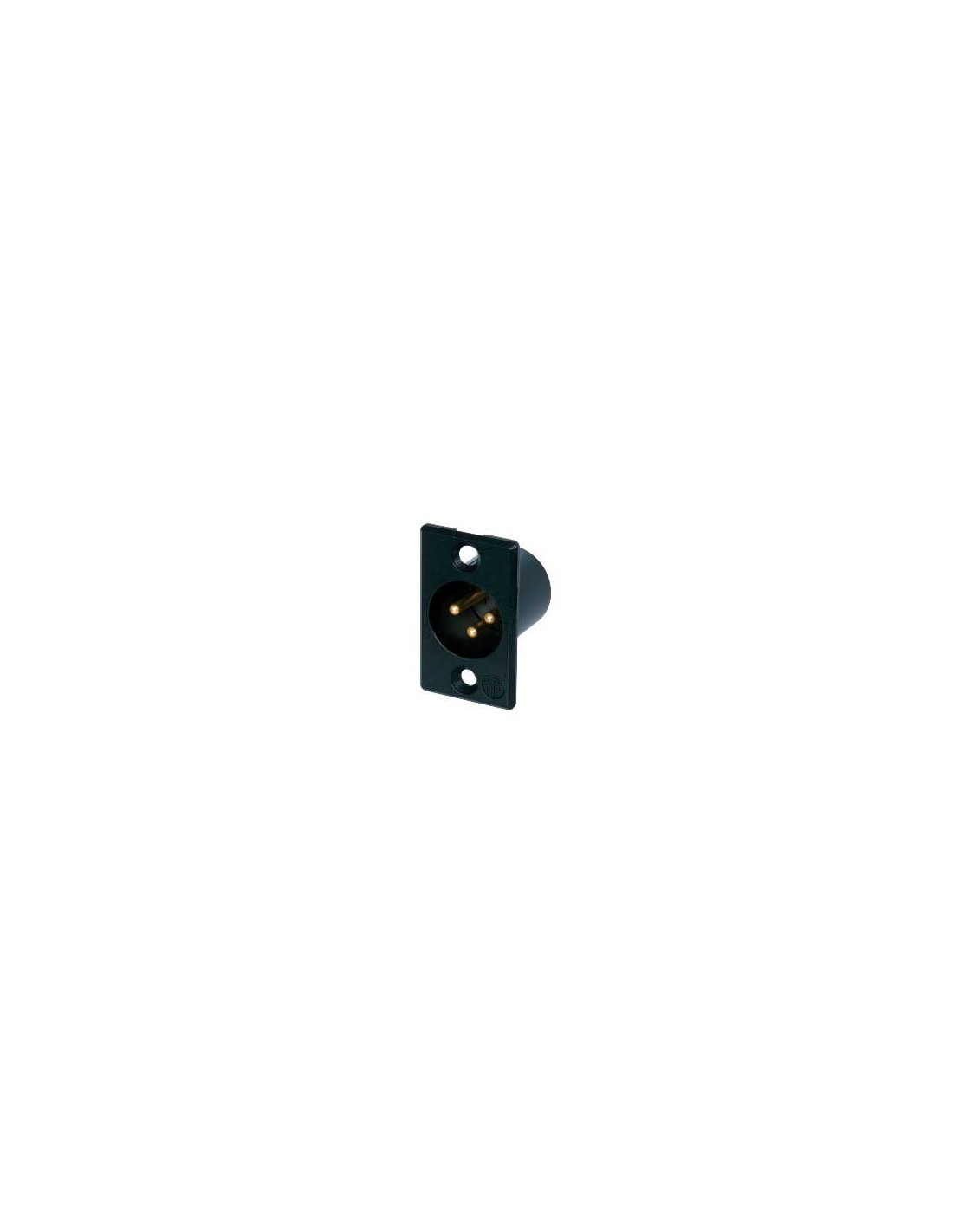 Conector de chasis XLR macho de 3 pines. Serie P. Color: negro, contactos en oro. Conector de montaje en panel metálico de estilo tradicional más pequeño disponible, con grandes copas de soldadura para facilitar el cableado. Especificaciones mecánicas: contactos de soldadura, dispositivo de bloqueo mediante cerradura de pestillo. Materiales: carcasa de zinc. Especificaciones ambientales: inflamabilidad UL 94 HB, norma IEC 61076-2-103, protección IP 40, rango de temperatura -30 °C a +80 °C.