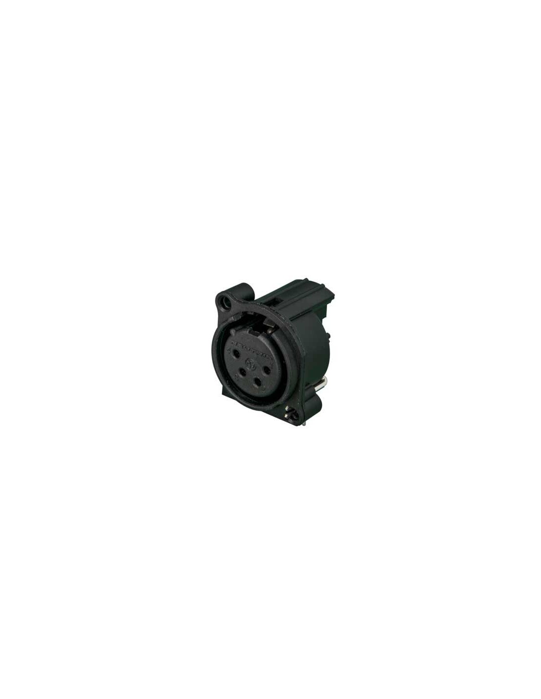 Conector de chasis XLR hembra de 4 pines. Serie A. Color: negro, contactos en oro. Montaje horizontal en PCB. Cuerpo redondo de plástico más rentable. Receptáculo XLR más pequeño, mayor densidad de empaquetado (23 mm entre centros). Conexión a tierra: contacto de tierra separado para la carcasa del conector y el panel frontal. Contactos tipo horquilla de nuevo diseño nuevo, con chapado en oro y áreas de contacto pulidas. Integra resorte de retención en lugar de pestillo. Materiales: carcasa de poliamida. Especificaciones ambientales: inflamabilidad UL 94 V-0, norma IEC 61076-2-103, protección IP 40, rango de temperatura -30 °C a +80 °C.