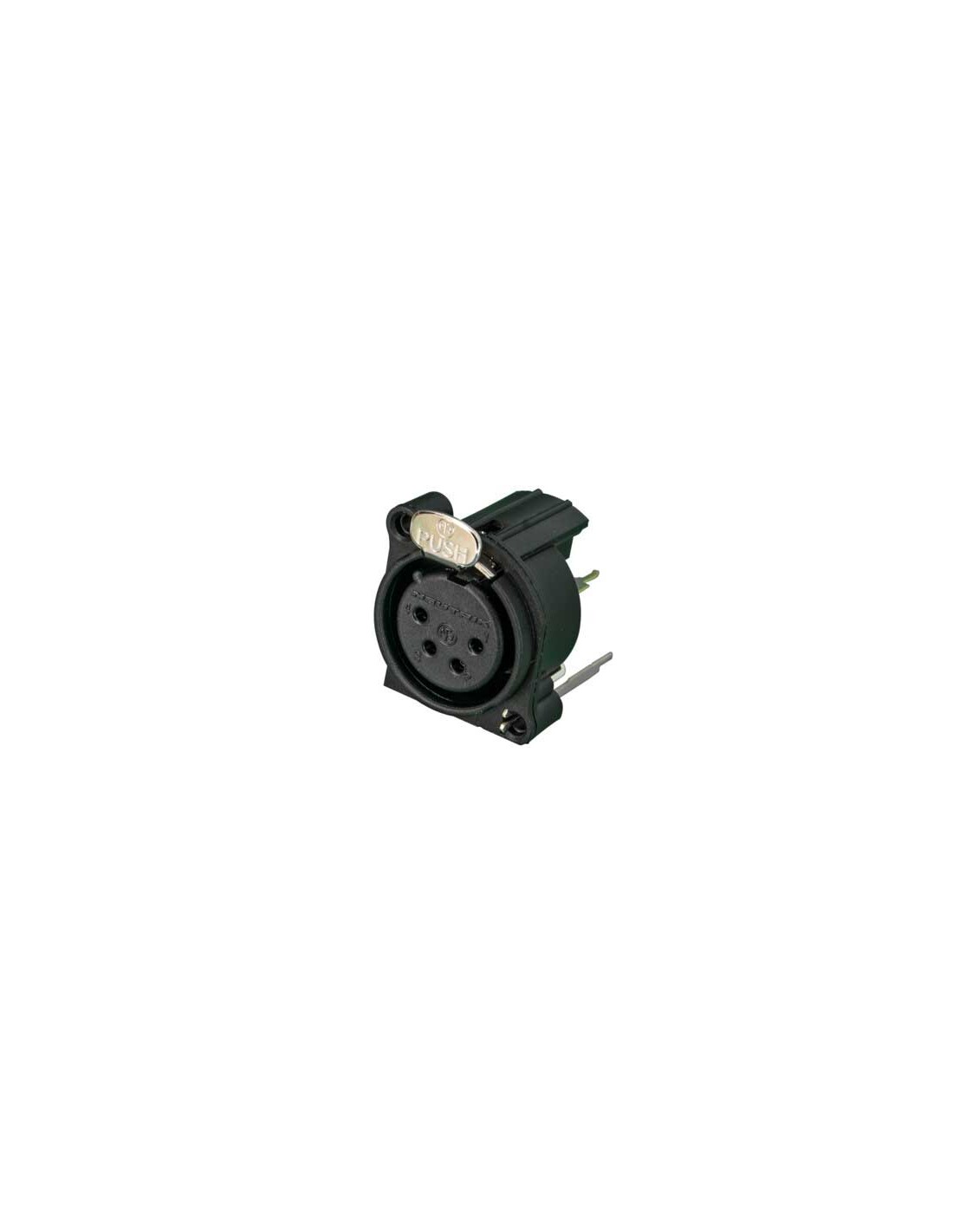 Conector de chasis XLR hembra de 4 pines. Serie A. Color: negro, contactos en oro. Montaje vertical en PCB. Cuerpo redondo de plástico más rentable. Receptáculo XLR más pequeño, mayor densidad de empaquetado (23 mm entre centros). Conexión a tierra: contacto de tierra separado para la carcasa del conector y el panel frontal. Contactos tipo horquilla de nuevo diseño nuevo, con chapado en oro y áreas de contacto pulidas. Dispositivo de bloqueo mediante cerradura de pestillo. Materiales: carcasa de poliamida. Especificaciones ambientales: inflamabilidad UL 94 V-0, norma IEC 61076-2-103, protección IP 40, rango de temperatura -30 °C a +80 °C.
