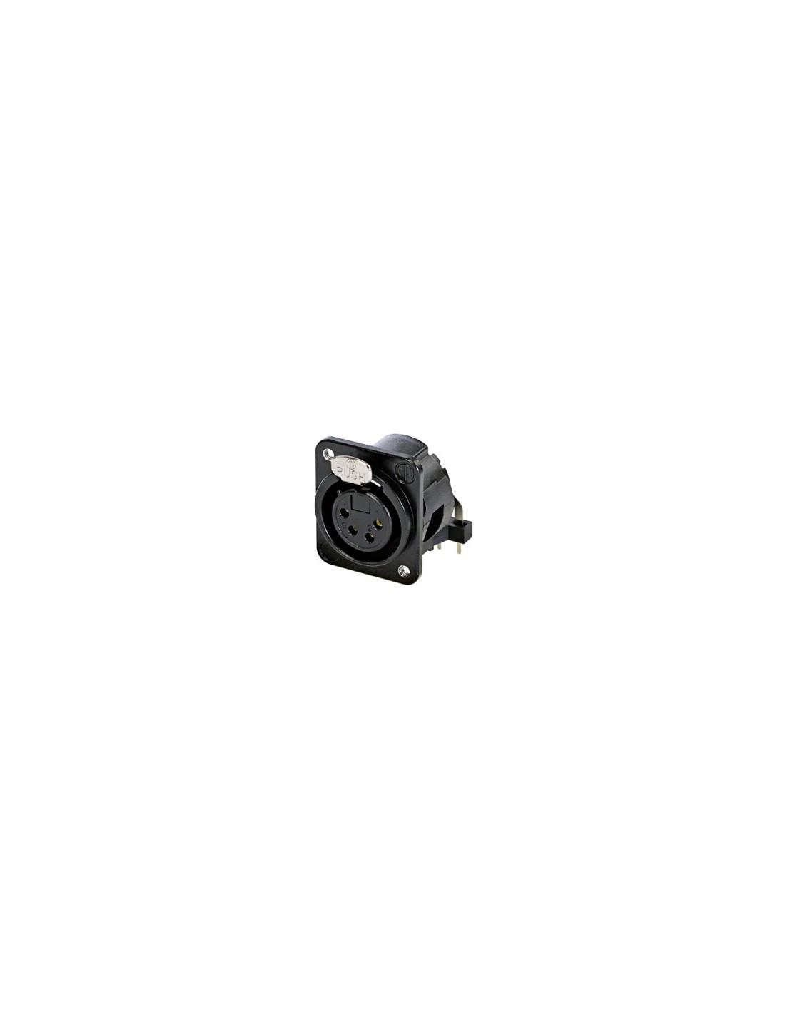 Conector de chasis XLR hembra de 4 pines. Serie D. Color: negro, contactos en oro. Montaje horizontal en PCB. Orificios de montaje M3. Serie de receptáculos XLR universales para montaje en panel con cuerpo metálico de tamaño D para aplicaciones de montaje en placa PCB. El inserto se puede extraer de la carcasa para facilitar el montaje. Óptima protección RF mediante 3 contactos de apantallamiento. Especificaciones mecánicas: sistema de bloqueo mediante cerradura de pestillo. Materiales: carcasa de zinc. Especificaciones ambientales: inflamabilidad UL 94 V-0, norma IEC 61076-2-103, protección IP 40, rango de temperatura -30 °C a +80 °C.