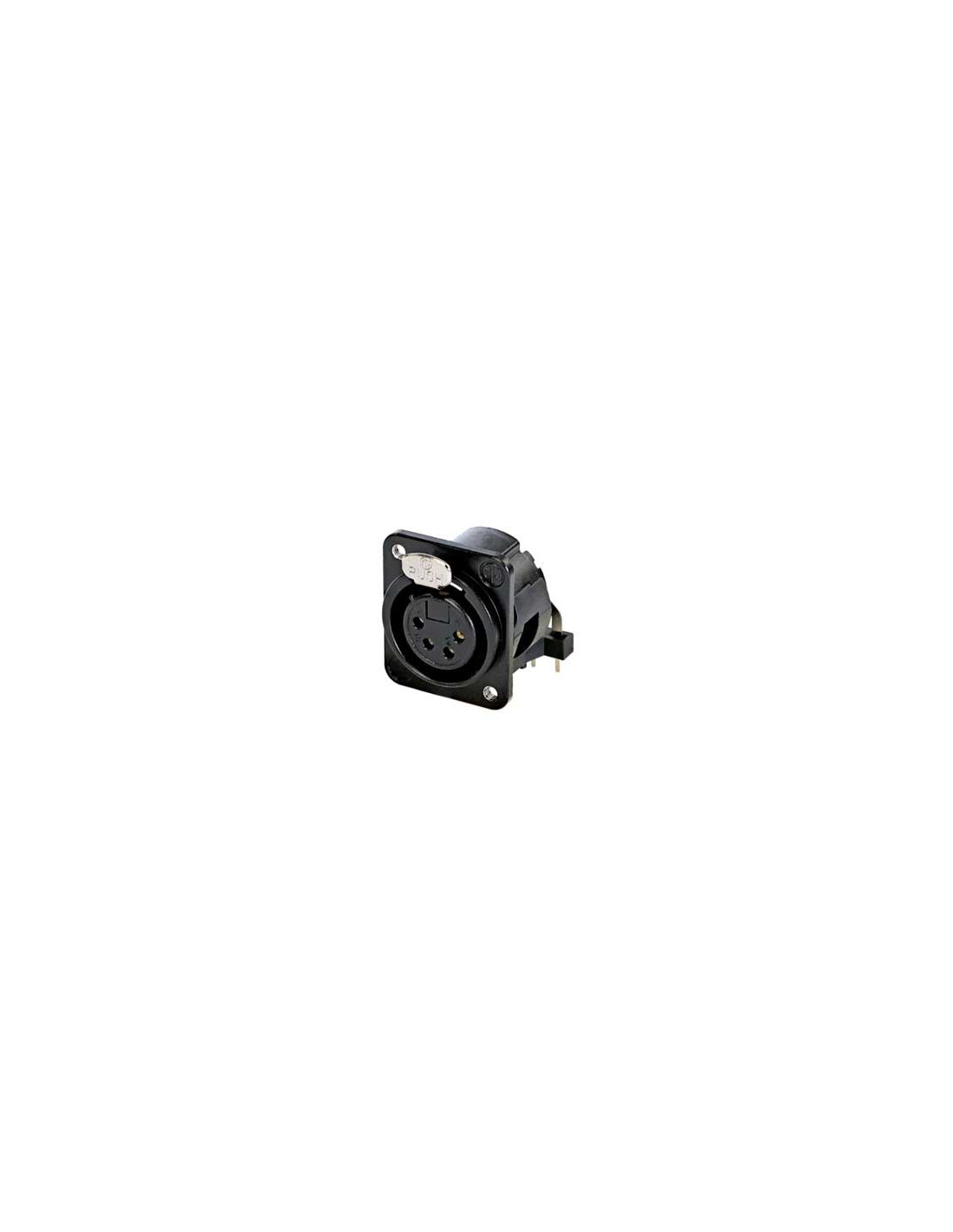 Conector de chasis XLR hembra de 4 pines. Serie D. Color: negro, contactos en plata. Montaje horizontal en PCB. Orificios de montaje M3. Serie de receptáculos XLR universales para montaje en panel con cuerpo metálico de tamaño D para aplicaciones de montaje en placa PCB. El inserto no se puede extraer de la carcasa. Contacto de masa dúplex que ofrece una excelente protección y apantallamiento RF. Sistema de bloqueo mediante cerradura de pestillo. Materiales: carcasa de zinc. Especificaciones ambientales: inflamabilidad UL 94 V-0, norma IEC 61076-2-103, protección IP 40, rango de temperatura -30 °C a +80 °C.