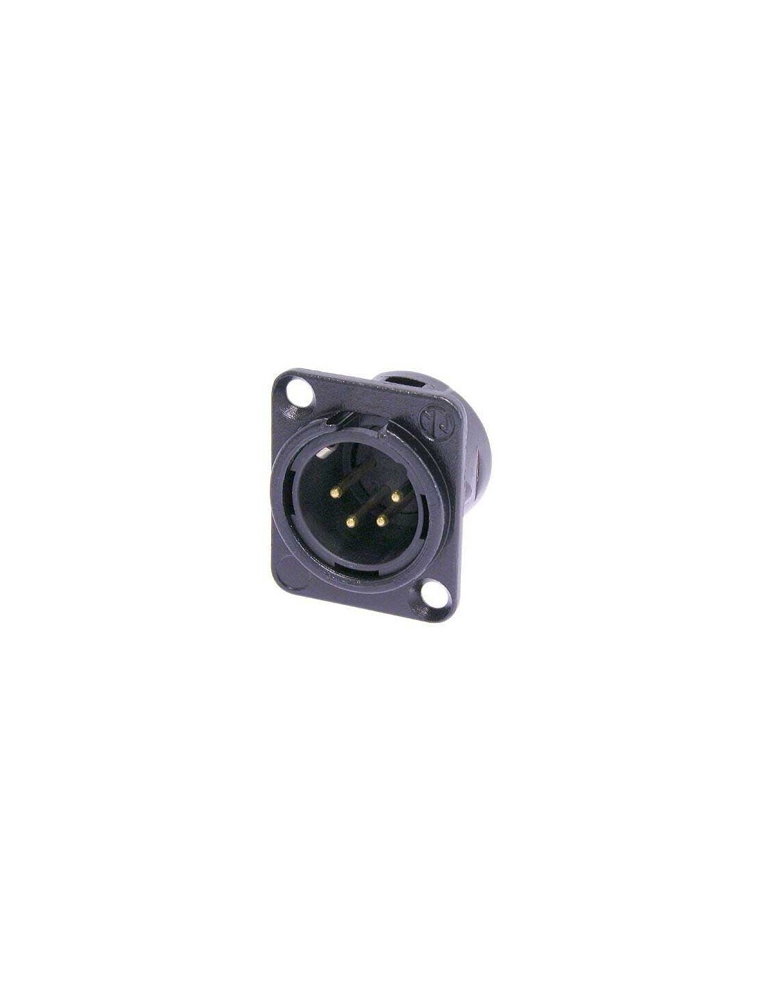 Conector de chasis XLR macho de 4 pines. Serie DL. Color: negro, contactos en plata. Serie universal XLR de montaje en panel, con cuerpo metálico de tamaño D. Especificaciones mecánicas: contactos de soldadura, dispositivo de bloqueo mediante cerradura de pestillo. Materiales: carcasa de zinc. Especificaciones ambientales: inflamabilidad UL 94 V-0, norma IEC 61076-2-103, protección IP 40, rango de temperatura -30 °C a +80 °C.