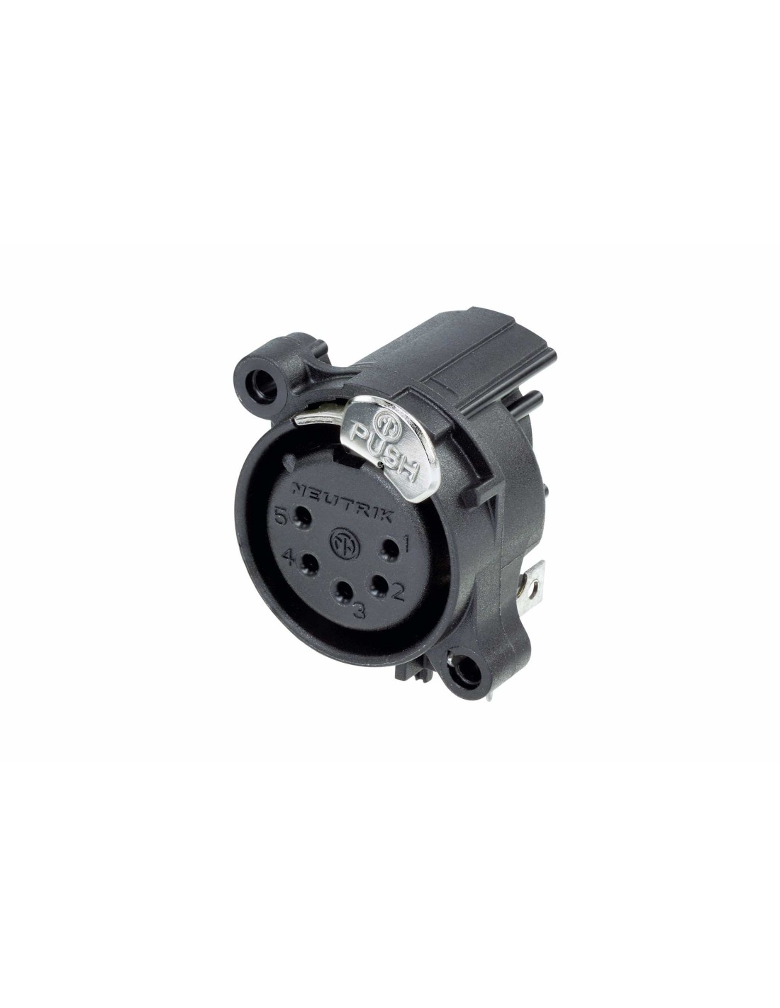 Conector de chasis XLR hembra de 5 pines. Serie A. Color: negro, contactos en oro. Montaje horizontal en PCB. Cuerpo redondo de plástico más rentable. Receptáculo XLR más pequeño, mayor densidad de empaquetado (23 mm entre centros). Emplea un sistema de pestillo de empuje asimétrico que permite un ahorro de espacio adicional de aproximadamente un 20 %. Conexión a tierra: contacto de tierra separado para la carcasa del conector y el panel frontal. Diseño de contacto tipo Tulipán con alta presión de contacto para una durabilidad máxima. Integra resorte de retención en lugar de pestillo. Materiales: carcasa de poliamida. Especificaciones ambientales: inflamabilidad UL 94 V-0, norma IEC 61076-2-103, protección IP 40, rango de temperatura -30 °C a +80 °C.