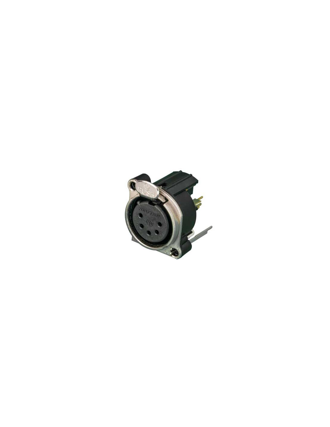 Conector de chasis XLR hembra de 5 pines. Serie B. Color: níquel, contactos en oro. Montaje vertical en PCB. Brida de montaje metálica con contacto de tierra circunferencial continuo al chasis para una mejor protección EMC y RF. Receptáculo XLR más pequeño, mayor densidad de empaquetado. Conexión a tierra: contacto de tierra separado para la carcasa del conector y el panel frontal, sin conexión al pin 1. Contactos tipo horquilla de nuevo diseño nuevo. Dispositivo de bloqueo mediante cerradura de pestillo. Materiales: anillo de zinc, inserto de poliamida. Especificaciones ambientales: inflamabilidad UL 94 V-0, norma IEC 61076-2-103, protección IP 40, rango de temperatura -30 °C a +80 °C.
