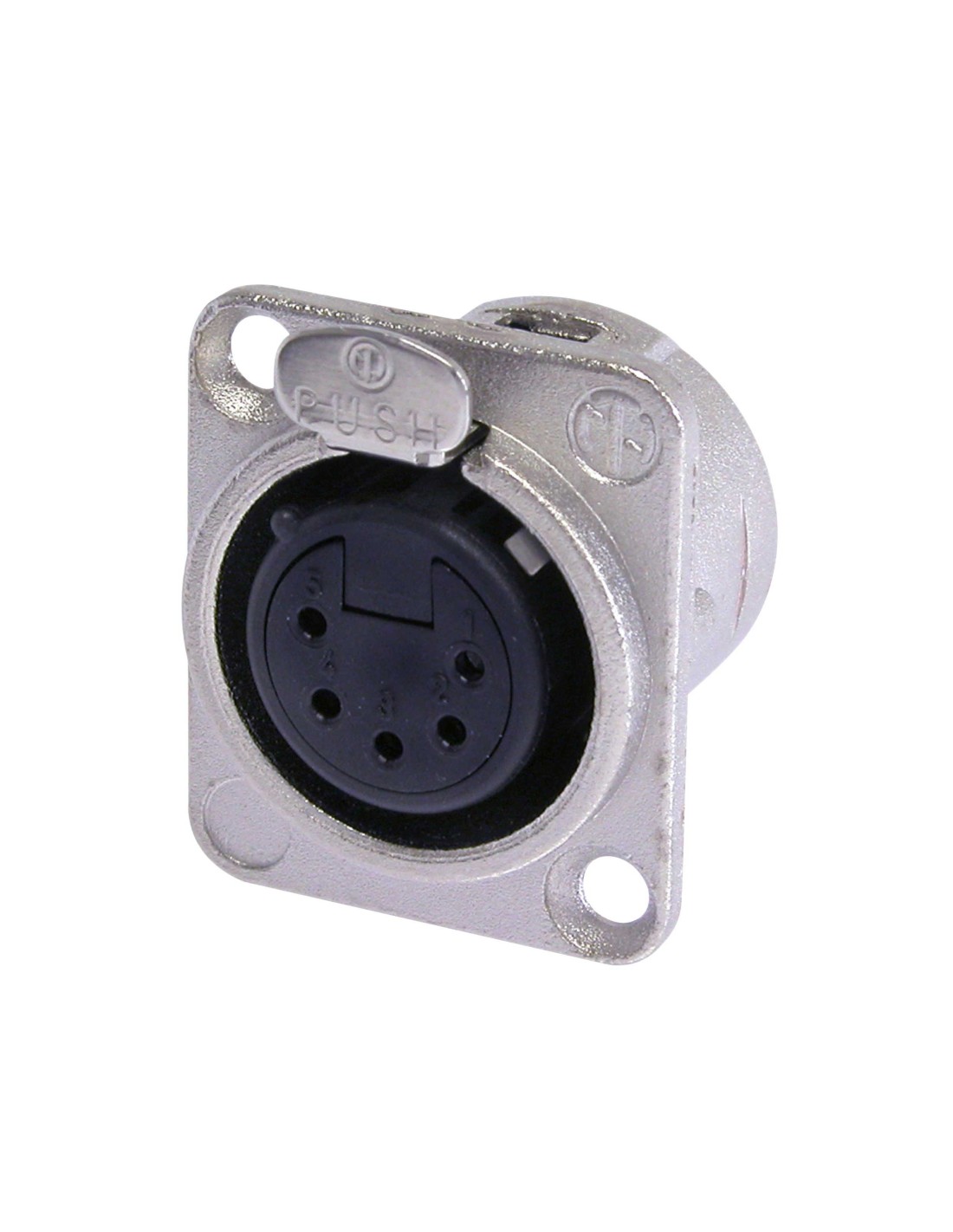 Conector de chasis XLR hembra de 5 pines. Serie DL. Color: níquel, contactos en plata. Serie universal XLR de montaje en panel, con cuerpo metálico de tamaño D. Diseñado para soldar los cables directamente a las copas de soldadura, lo que facilita la instalación y evita problemas de conexión. Sistema de bloqueo mediante cerradura de pestillo. Materiales: carcasa de zinc. Especificaciones ambientales: inflamabilidad UL 94 V-0, norma IEC 61076-2-103, protección IP 40, rango de temperatura -30 °C a +80 °C.