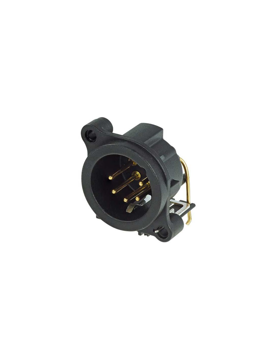 Conector de chasis XLR macho de 5 pines. Serie A. Color: negro, contactos en oro. Montaje horizontal en PCB. Cuerpo redondo de plástico más rentable. Contacto de masa separado conectado a la carcasa del conector y al panel frontal, sin conexión al pin 1. Receptáculo XLR más pequeño, mayor densidad de empaquetado (23 mm entre centros). Dispositivo de bloqueo mediante cerradura de pestillo. Materiales: carcasa de poliamida. Especificaciones ambientales: inflamabilidad UL 94 V-0, norma IEC 61076-2 103, protección IP 40, rango de temperatura -30 °C a +80 °C.