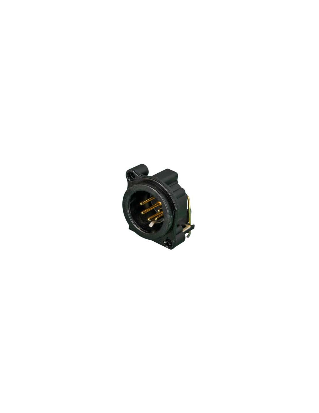 Conector de chasis XLR macho de 5 pines. Serie B. Color: negro, contactos en oro. Montaje horizontal en PCB. Brida de montaje de metal con contacto de tierra circunferencial continuo con el chasis para una mejor protección EMC y RF. Contacto de masa separado conectado a la carcasa del conector y al panel frontal, sin conexión al pin 1. Receptáculo XLR más pequeño, mayor densidad de empaquetado. Dispositivo de bloqueo mediante cerradura de pestillo. Materiales: anillo de zinc, inserto de poliamida. Especificaciones ambientales: inflamabilidad UL 94 V-0, norma IEC 61076-2 103, protección IP 40, rango de temperatura -30 °C a +80 °C.