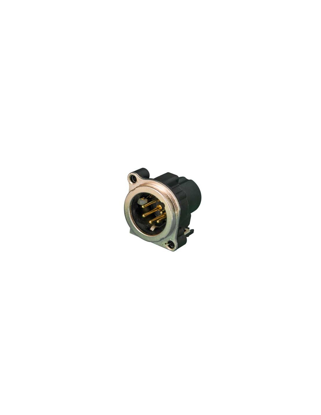 Conector de chasis XLR macho de 5 pines. Serie B. Color: níquel, contactos en oro. Montaje vertical en PCB. Conmutación de contactos. Brida de montaje de metal con contacto de tierra circunferencial continuo con el chasis para una mejor protección EMC y RF. Contacto de masa separado conectado a la carcasa del conector y al panel frontal, sin conexión al pin 1. Receptáculo XLR pequeño, mayor densidad de empaquetado. Los contactos de conmutación se activan mediante el conector de acoplamiento, lo que permite indicar y controlar la conexión acoplada. El conmutador ofrece un contacto normal abierto y normal cerrado. Bloqueo mediante cerradura de pestillo. Materiales: anillo de zinc. Especificaciones ambientales: inflamabilidad UL 94 V-0, protección IP 40, rango de temperatura -30 °C a +80 °C.