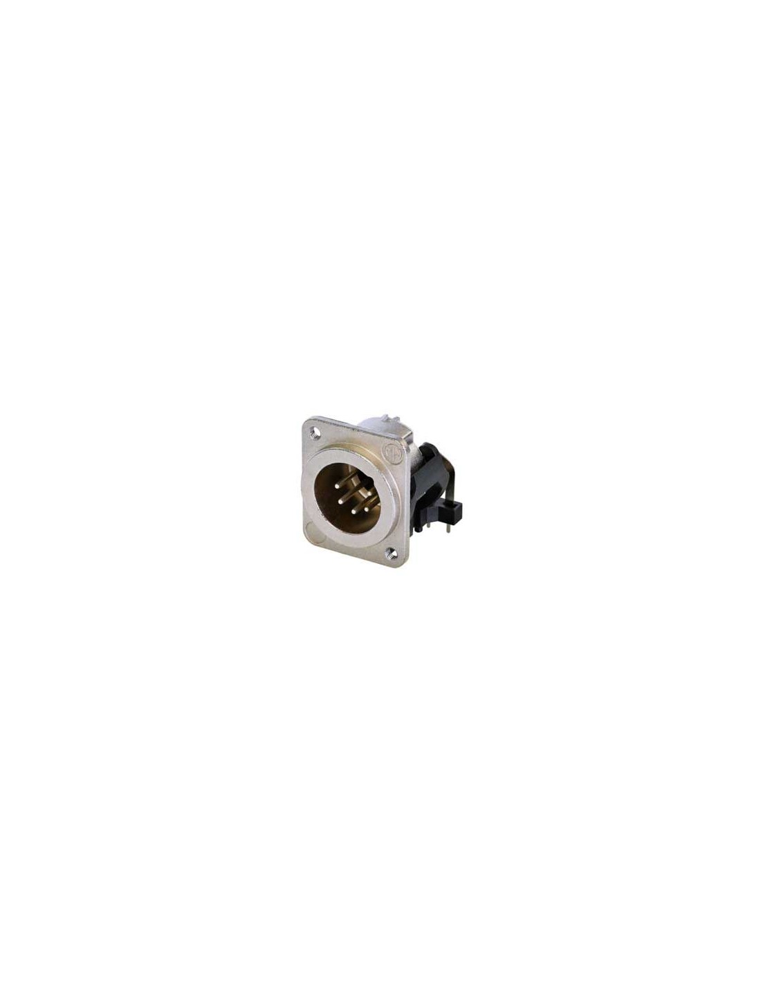 Conector de chasis XLR macho de 5 pines. Serie D. Color: níquel, contactos en plata. Montaje horizontal en PCB. Orificios de montaje M3. Toma de tierra dúplex, que ofrece una excelente protección y apantallamiento RF. El inserto no es removible de la carcasa. Especificaciones mecánicas: sistema de bloqueo mediante cerradura de pestillo. Materiales: carcasa de zinc. Especificaciones ambientales: inflamabilidad UL 94 V-0, protección IP 40, rango de temperatura -30 °C a +80 °C.