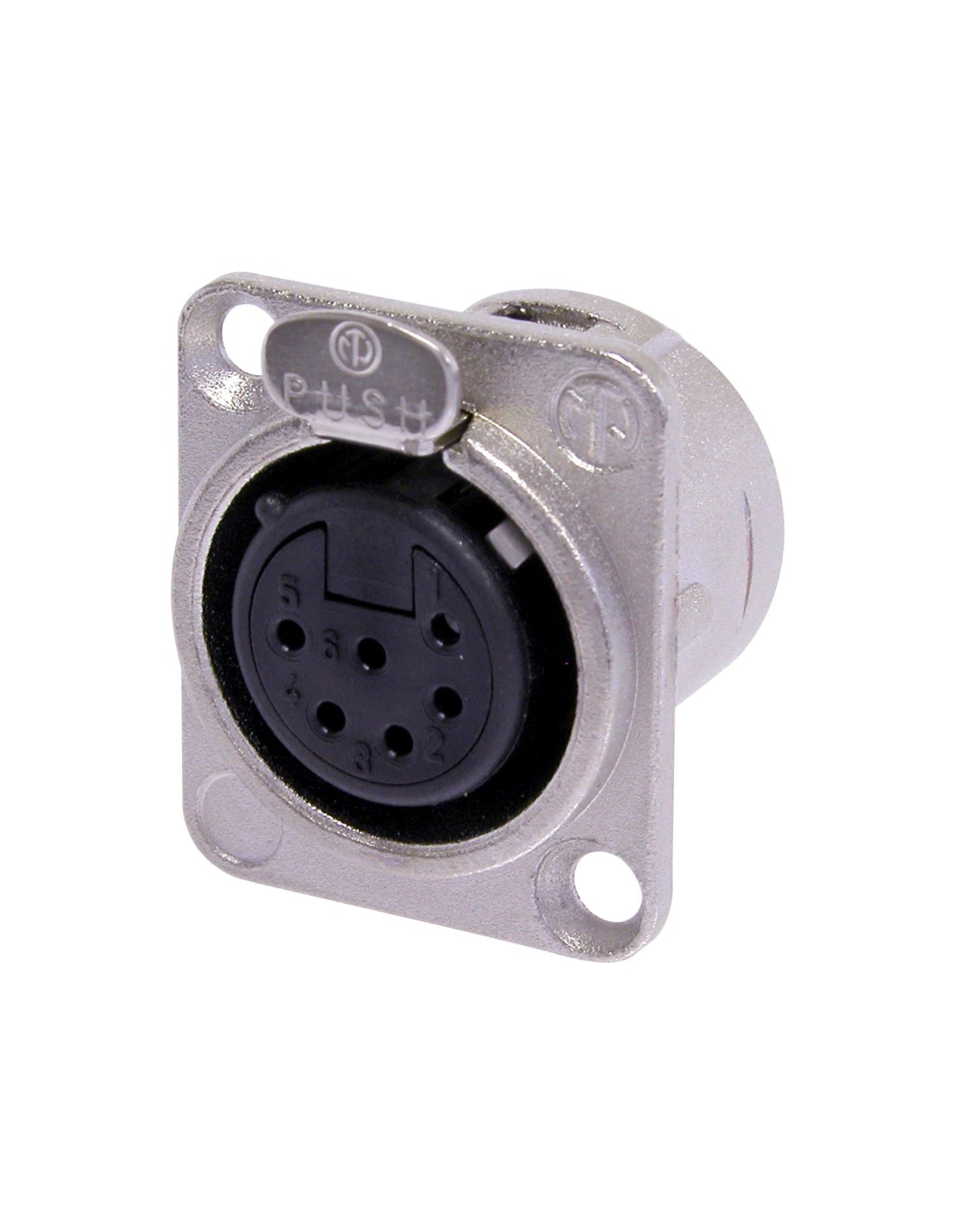 Conector de chasis XLR hembra de 6 pines. Serie DL. Color: níquel, contactos en plata. Serie universal XLR de montaje en panel, con cuerpo metálico de tamaño D. Diseñado para soldar los cables directamente a las copas de soldadura, lo que facilita la instalación y evita problemas de conexión. Sistema de bloqueo mediante cerradura de pestillo. Materiales: carcasa de zinc. Especificaciones ambientales: inflamabilidad UL 94 HB, norma IEC 61076-2-103, protección IP 40, rango de temperatura -30 °C a +80 °C.