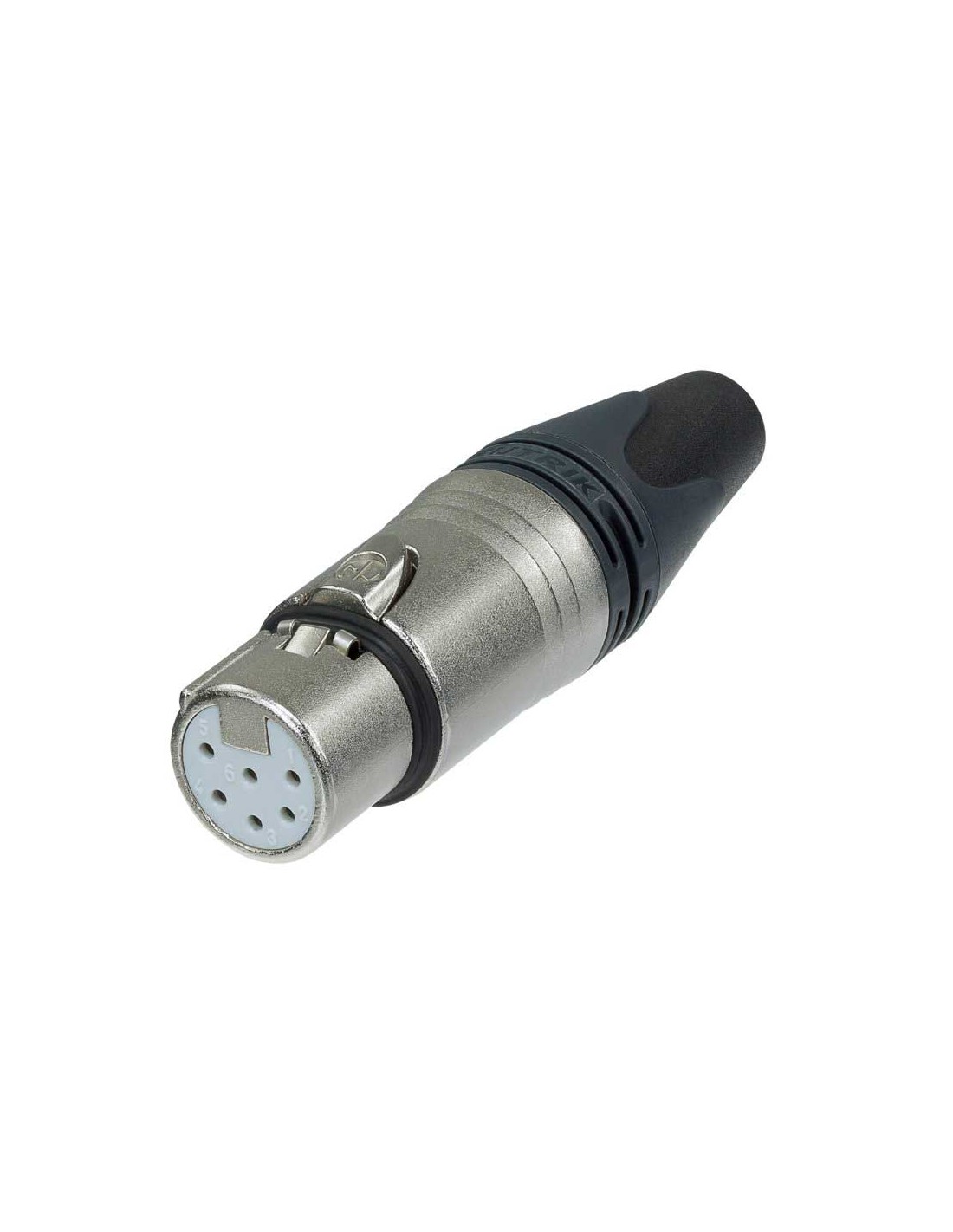 Conector aéreo XLR hembra de 6 pines. Serie XX. Color: níquel, contactos en plata. Disposición de pines equivalente a la de Switchcraft. Mayor fiabilidad y facilidad de montaje. Baja resistencia de contacto y una alta integridad, con barrera de soldadura. Contactos de muelle de masa adicionales para mejorar la conexión a tierra de la carcasa. Prensaestopas de poliuretano que proporciona una alta protección contra tensiones del cable. Especificaciones mecánicas: diámetro exterior del cable 3,5 - 8,0 mm, sistema de bloqueo mediante cerradura de pestillo. Materiales: caperuza de poliuretano, carcasa de zinc. Especificaciones ambientales: inflamabilidad UL 94 HB, cumplimiento de normas IEC 61076-2-103, protección IP 40, rango de temperatura -30 °C a +80 °C.