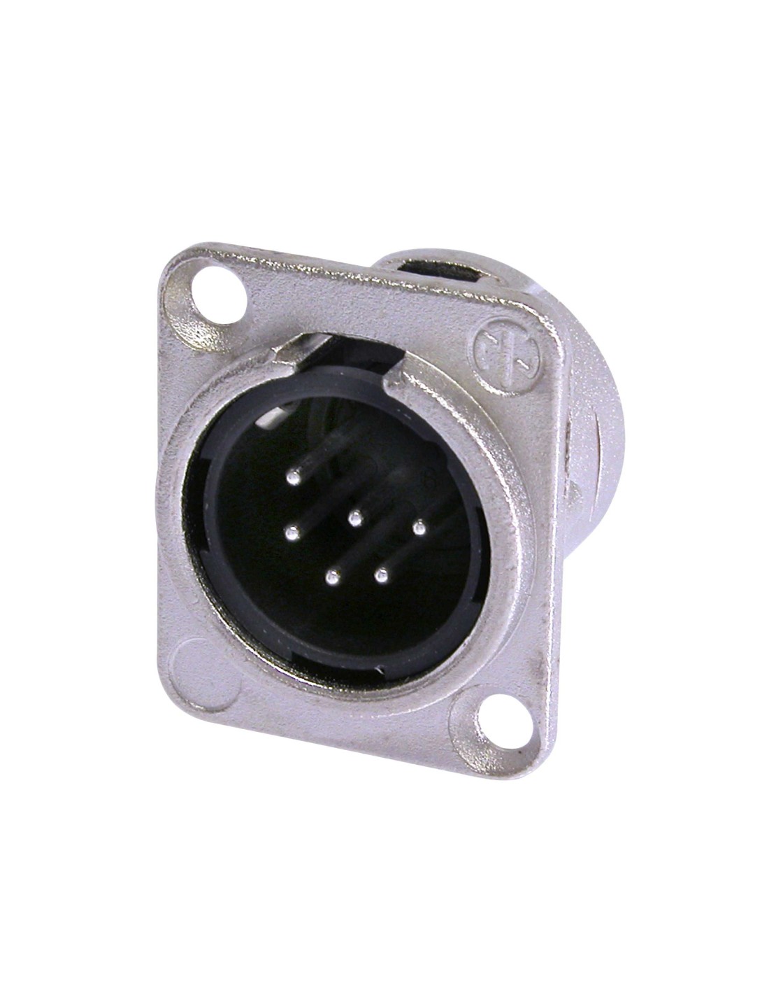 Conector de chasis XLR macho de 6 pines. Serie DL. Color: níquel, contactos en plata. Serie universal XLR de montaje en panel, con cuerpo metálico de tamaño D. Diseñado para soldar los cables directamente a las copas de soldadura, lo que facilita la instalación y evita problemas de conexión. Sistema de bloqueo mediante cerradura de pestillo. Materiales: carcasa de zinc. Especificaciones ambientales: inflamabilidad UL 94 HB, norma IEC 61076-2-103, protección IP 40, rango de temperatura -30 °C a +80 °C.