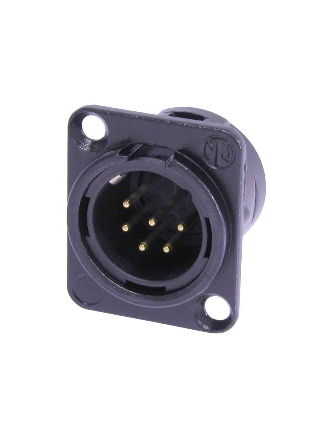 Conector de chasis XLR macho de 6 pines. Serie DL. Color: negro, contactos en oro. Serie universal XLR de montaje en panel, con cuerpo metálico de tamaño D. Diseñado para soldar los cables directamente a las copas de soldadura, lo que facilita la instalación y evita problemas de conexión. Sistema de bloqueo mediante cerradura de pestillo. Materiales: carcasa de zinc. Especificaciones ambientales: inflamabilidad UL 94 HB, norma IEC 61076-2-103, protección IP 40, rango de temperatura -30 °C a +80 °C.