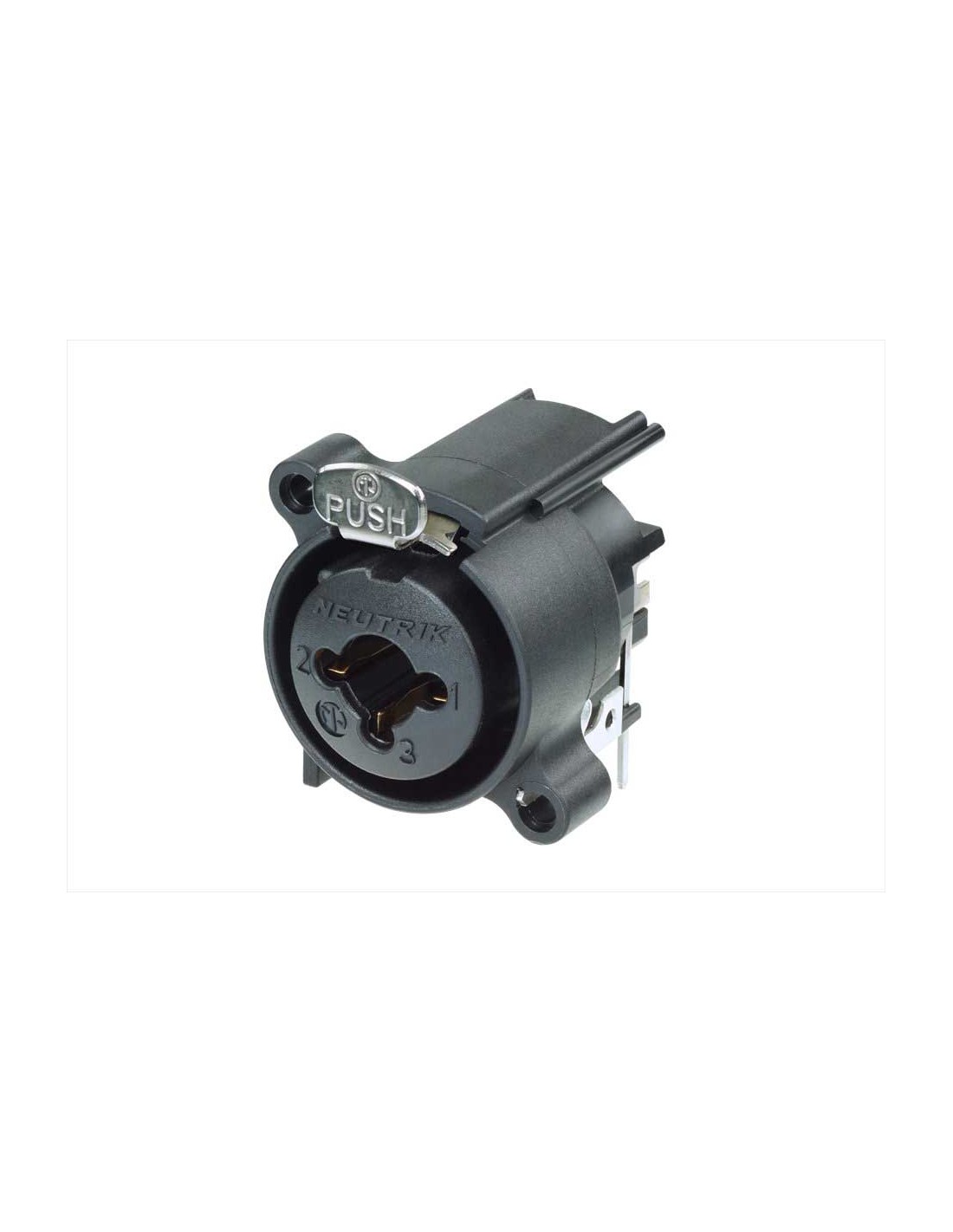 Conector de chasis combo XLR hembra de tres pines con TRS 1/4 hembra. Serie: Combo A. Color: negro, contactos en oro. Montaje horizontal en PCB. Recorte del panel frontal compatible con Neutrik XLR A Series. Diseñado para entradas balanceada de micro, señal de línea o instrumento en una sola carcasa XLR. Permite ahorrar espacio al combinar 2 conectores en una sola carcasa. Carcasa XLR de dimensiones más reducidas. Conductor de muy baja capacitancia, por lo que resulta adecuado para audio digital. Especificaciones mecánicas: dispositivo de bloqueo mediante cerradura de pestillo. Materiales: carcasa de poliamida. Especificaciones ambientales: inflamabilidad UL 94 V-0, protección IP 40, rango de temperatura -30 °C a +80 °C.