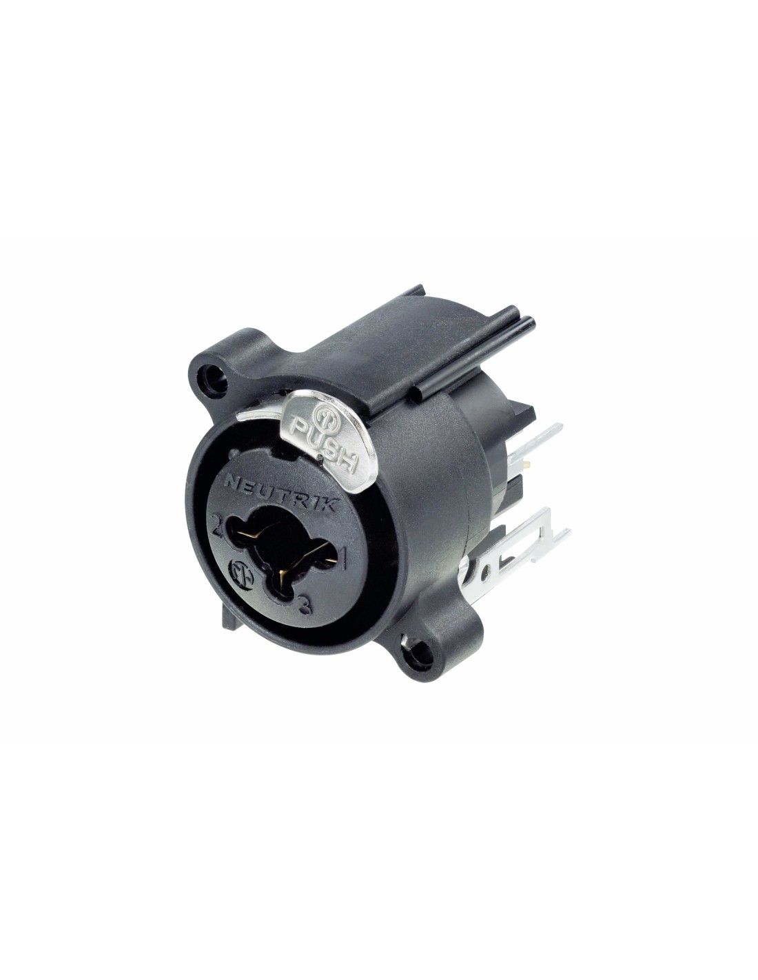 Conector de chasis combo XLR hembra de tres pines con TRS 1/4 hembra. Serie: Combo A. Color: negro, contactos en oro. Montaje vertical en PCB. Recorte del panel frontal compatible con Neutrik XLR A Series. Diseñado para entradas balanceada de micro, señal de línea o instrumento en una sola carcasa XLR. Permite ahorrar espacio al combinar 2 conectores en una sola carcasa. Carcasa XLR de dimensiones más reducidas. Conductor de muy baja capacitancia, por lo que resulta adecuado para audio digital. Emplea un sistema de pestillo de empuje asimétrico que permite un ahorro de espacio adicional de aproximadamente un 20 %.. Materiales: carcasa de poliamida. Especificaciones ambientales: inflamabilidad UL 94 V-0, protección IP 40, rango de temperatura -30 °C a +80 °C.