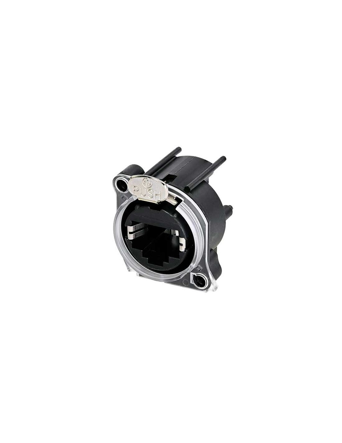 Conector de chasis etherCON hembra. Conexión RJ45 compatible con CAT5e. Serie: etherCON A. Color: negro, contactos en oro. Montaje horizontal en PCB. Optimizado para aplicaciones de redes de audio, video e iluminación profesionales. Carcasa de plástico, que integra el anillo luminoso para indicación de estado y elementos de empuje asimétricos no metálicos. Lengüeta de empuje asimétrica ESD, mejora la protección contra descargas electrostáticas. No es compatible con los conectores de aéreos CAT6 NE8MC6-MO y NKE6S*. Especificaciones mecánicas: sistema de bloqueo mediante cerradura de pestillo. Materiales: carcasa de poliamida. Especificaciones ambientales: inflamabilidad UL 94 V-0, IP 40, rango de temperatura -30 °C a +80 °C.