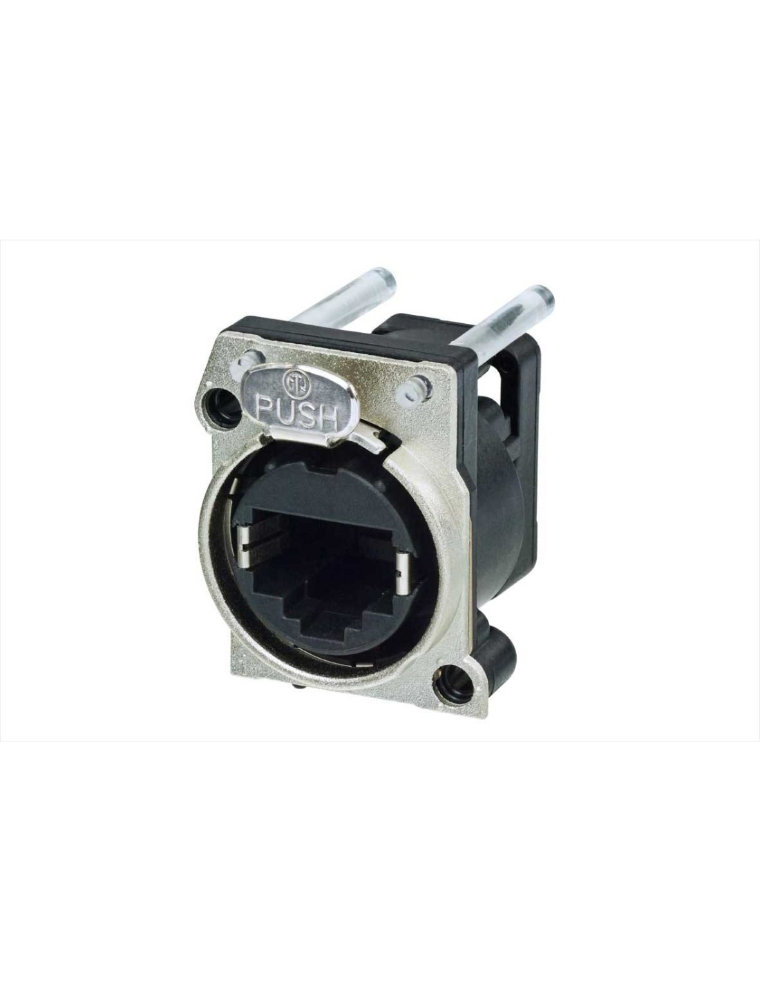 Conector de chasis etherCON hembra. Conexión RJ45 compatible con CAT5e. Serie: etherCON A. Color: negro, contactos en oro. Montaje vertical en PCB, a 24 mm del panel frontal, compatible con las dimensiones estándar de la industria para conectores XLR, jacks de 1/4, etc. Optimizado para aplicaciones de redes de audio, video e iluminación profesionales. Grosor máximo del panel de 3 mm. Carcasa fabricada completamente en plástico, para un diseño más compacto y rentable. No es compatible con los conectores de aéreos CAT6 NE8MC6-MO y NKE6S*. Especificaciones mecánicas: sistema de bloqueo mediante cerradura de pestillo. Materiales: carcasa de poliamida. Especificaciones ambientales: inflamabilidad UL 94 V-0, rango de temperatura -30 °C a +80 °C.