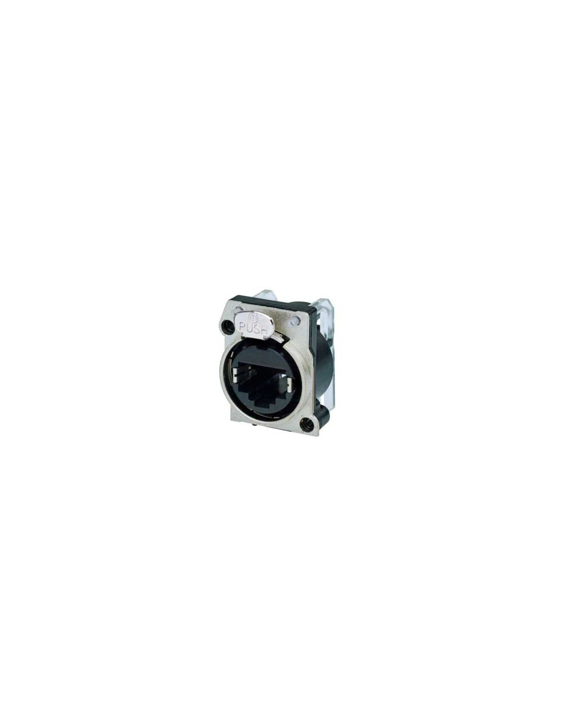 Conector de chasis etherCON hembra. Conexión RJ45 compatible con CAT5e. Serie: etherCON B. Color: níquel, contactos en oro. Montaje horizontal en PCB. Placa frontal de metal resistente. Dos tubos de luz para LED SMD. Optimizado para aplicaciones de redes de audio, video e iluminación profesionales. Grosor máximo del panel de 3 mm. No es compatible con los conectores de aéreos CAT6 NE8MC6-MO y NKE6S*. Especificaciones mecánicas: sistema de bloqueo mediante cerradura de pestillo. Materiales: carcasa de zinc, inserto de poliamida. Especificaciones ambientales: inflamabilidad UL 94 V-0, rango de temperatura -30 °C a +80 °C.