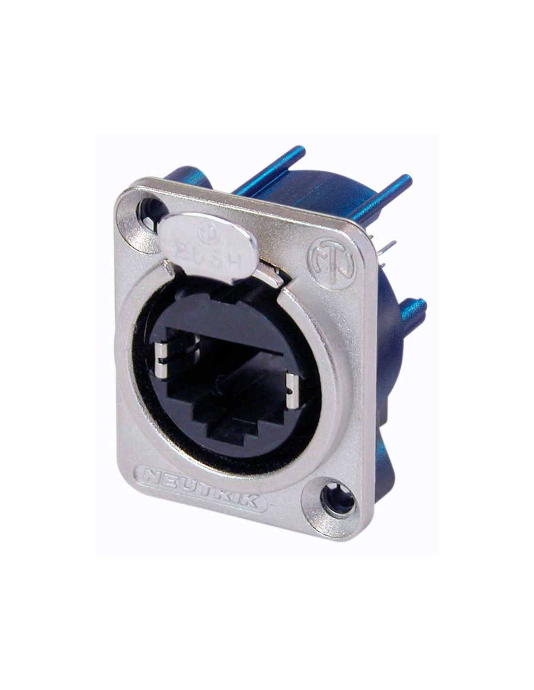 Conector de chasis etherCON hembra. Conexión RJ45 compatible con CAT5e. Serie: etherCON D. Color: níquel, contactos en oro. Montaje vertical en PCB. Carcasa con brida de metal en forma de D y cierre con pestillo. Optimizado para aplicaciones de redes de audio, video e iluminación profesionales. Grosor máximo del panel de 4 mm. No es compatible con los conectores de aéreos CAT6 NE8MC6-MO y NKE6S*. Especificaciones mecánicas: sistema de bloqueo mediante cerradura de pestillo. Materiales: carcasa de zinc, inserto de poliamida. Especificaciones ambientales: inflamabilidad UL 94 V-0, rango de temperatura -30 °C a +80 °C.