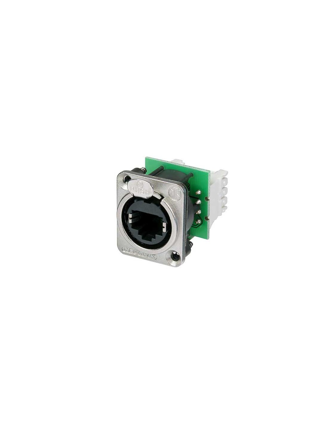 Conector de chasis etherCON hembra. Conexión RJ45 compatible con CAT5e. Serie: etherCON D. Color: níquel, contactos en oro. Carcasa con brida de metal en forma de D y cierre con pestillo. Montaje en PCB fácil y rápido mediante terminales perforados de tipo IDC 110. Optimizado para aplicaciones de redes de audio, video e iluminación profesionales. Grosor máximo del panel de 4 mm. Carcasa fabricada completamente en plástico, para un diseño más compacto y rentable. No es compatible con los conectores de aéreos CAT6 NE8MC6-MO y NKE6S*. Especificaciones mecánicas: sistema de bloqueo mediante cerradura de pestillo. Materiales: carcasa de zinc. Especificaciones ambientales: inflamabilidad UL 94 V-0, rango de temperatura -30 °C a +80 °C.