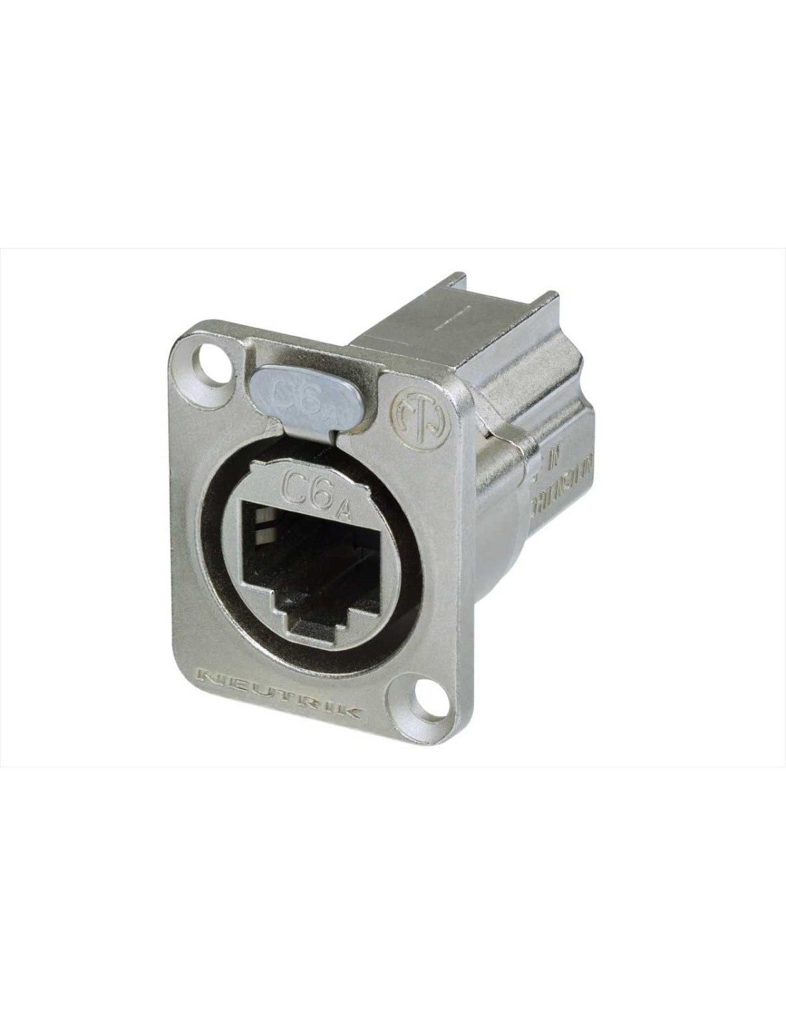 Conector de chasis etherCON hembra pasante para RJ45. Compatible con CAT6A. Serie: etherCON D. Color: níquel, contactos en oro. Sistema blindado: alta inmunidad al ruido y protección frente a interferencias electromagnéticas. Compatible con la gama etherCON CAT5 disponible. No es compatible con los conectores de aéreos CAT6 NE8MC6-MO y NKE6S*. Especificaciones mecánicas: sistema de bloqueo mediante cerradura de pestillo. Materiales: carcasa de zinc. Especificaciones ambientales: inflamabilidad UL 94 V-0, EN 45545 R26, rango de temperatura -40 °C a + 70 °C.