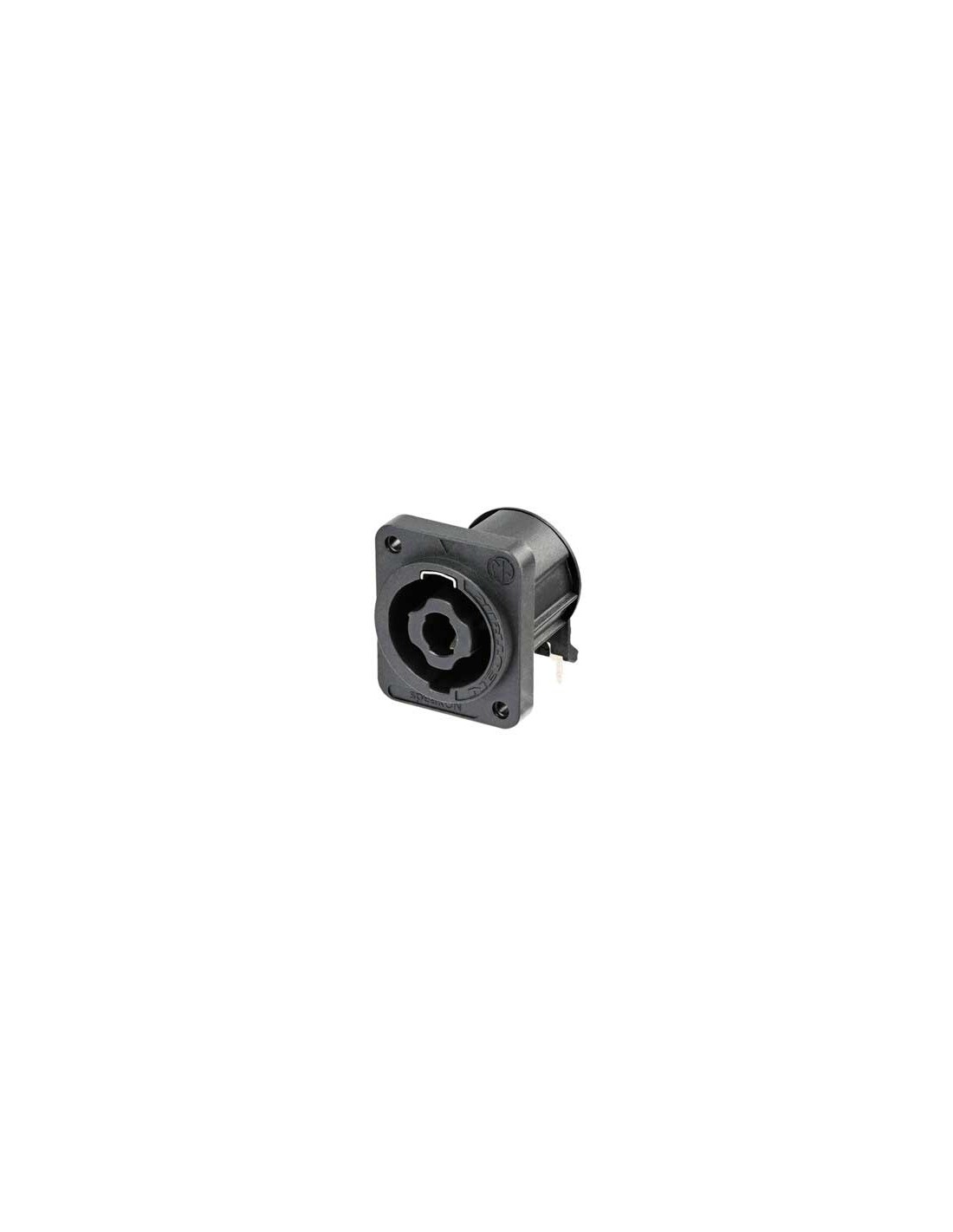 Conector de chasis speakON macho de 4 pines. Serie speakON Chassis. Color: negro, contactos en plata. Chasis tamaño D para montaje horizontal en PCB. Cuenta con un exclusivo sistema de bloqueo metálico que sólo hace contacto una vez que está completamente bloqueado. Orificios para tornillos autorroscantes (tornillo tipo A). Especificaciones mecánicas: sistema de bloqueo Quick Lock. Materiales: carcasa de poliamida. Especificaciones ambientales: inflamabilidad UL 94 V-0, rango de temperatura -30 °C a +80 °C.
