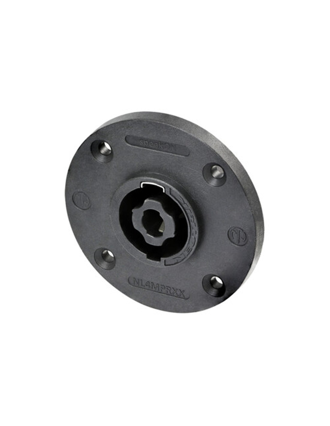 Conector de chasis speakON macho de 4 pines. Serie speakON Chassis. Color: negro, contactos en plata. Chasis tamaño G. Agujeros pasantes avellanados. Pestañas planas de 3/16. Cuenta con un exclusivo sistema de bloqueo metálico que sólo hace contacto una vez que está completamente bloqueado. Especificaciones mecánicas: sistema de bloqueo Quick Lock, inserto metálico en la zona de cierre. Materiales: carcasa de poliamida. Especificaciones ambientales: inflamabilidad UL94 V-0, rango de temperatura -30 °C a +80 °C.