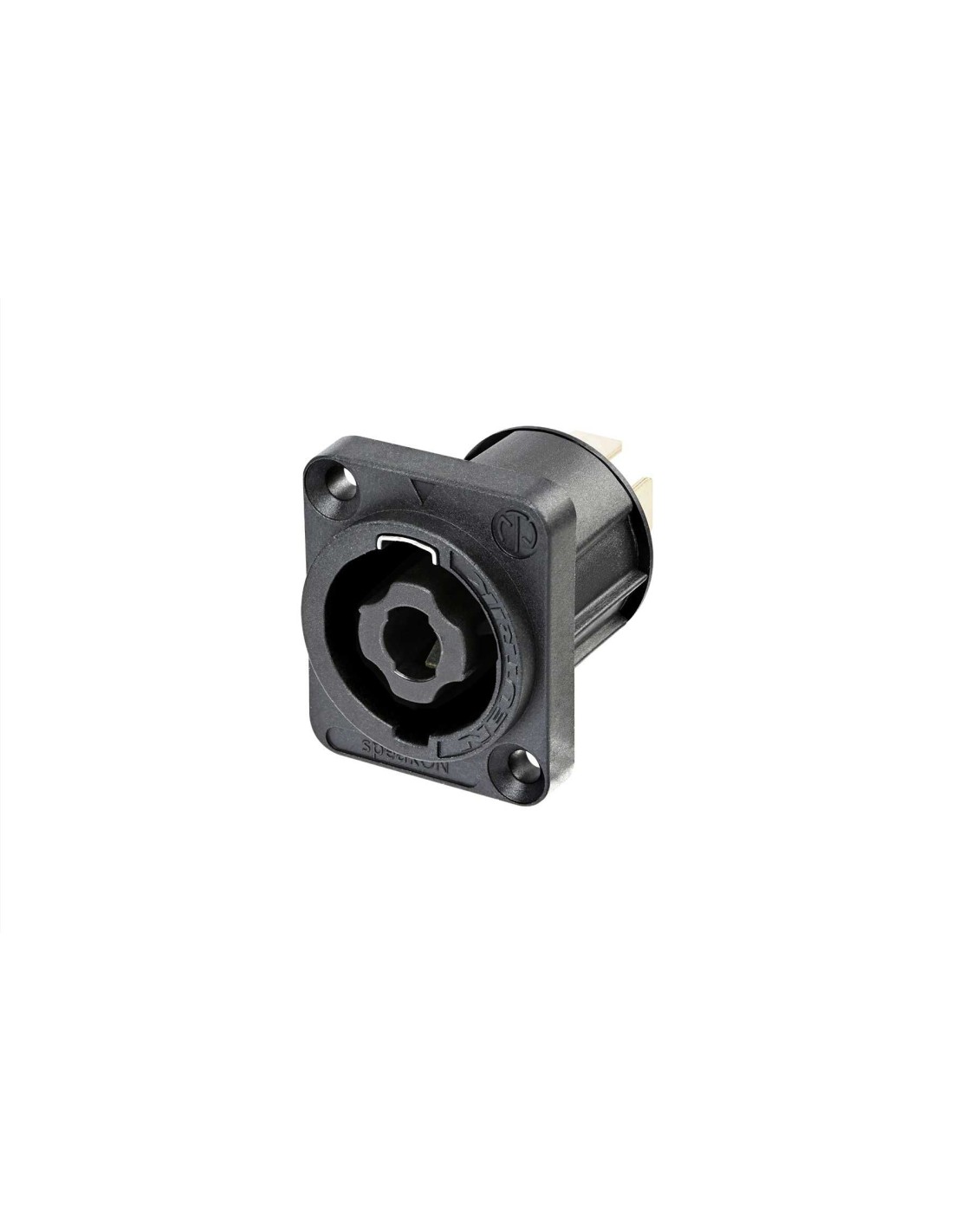Conector de chasis speakON macho de 4 pines. Serie speakON Chassis. Color: negro, contactos en plata. Chasis tamaño D. Pestañas planas de 1/4. Orificios pasantes avellanados. Cuenta con un exclusivo sistema de bloqueo metálico que sólo hace contacto una vez que está completamente bloqueado. Corriente nominal de 30 A RMS continuos. Especificaciones mecánicas: sistema de bloqueo Quick Lock, inserto metálico en la zona de cierre. Materiales: carcasa de poliamida. Especificaciones ambientales: inflamabilidad UL 94 V-0, rango de temperatura -30 °C a +80 °C.