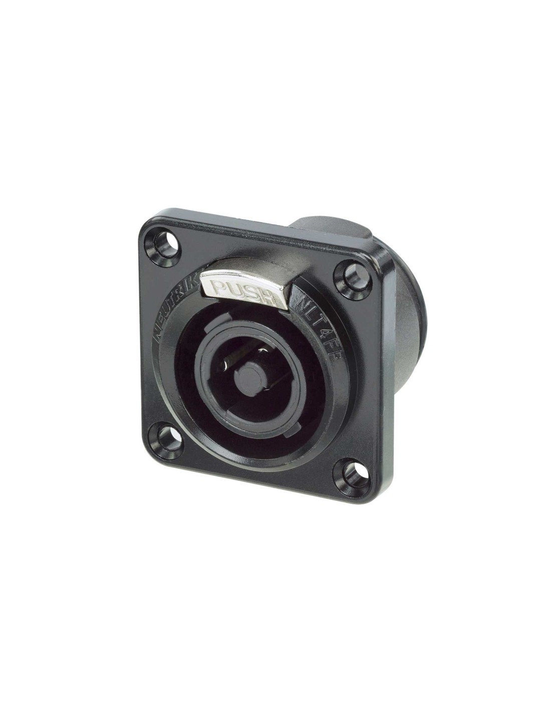 Conector aéreo speakON hembra de 4 pines. Serie STX. Color: negro, contactos en plata. Chasis tamaño D para montaje vertical en PCB. Carcasa metálica extremadamente robusta diseñada para entornos exigentes. Corriente nominal de 40 A RMS continuos. Especificaciones mecánicas: orificios para tornillos autorroscantes (tornillo A), sistema de bloqueo por giro Quick Lock. Materiales: carcasa de zinc, inserto de poliamida. Especificaciones ambientales: inflamabilidad UL 94 HB, protección IP 54 en estado acoplado, rango de temperatura -30 °C a +80 °C.