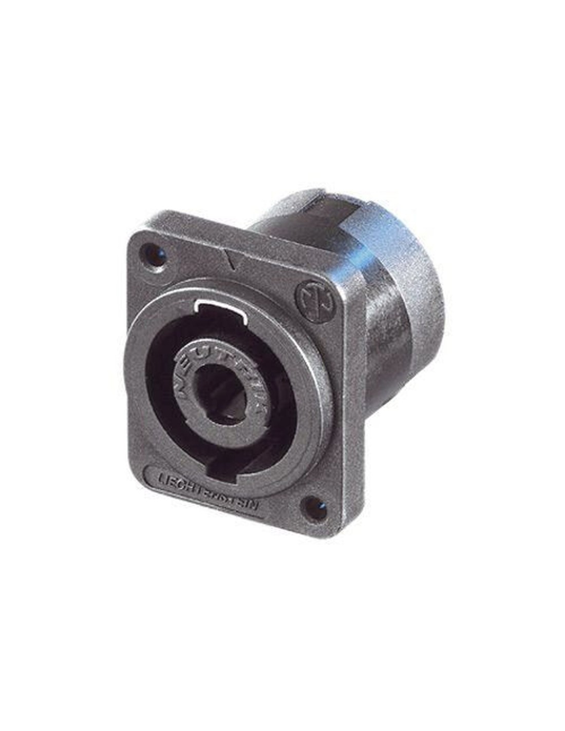 Conector aéreo speakON macho de 4 pines. Serie speakON Chassis. Color: gris, contactos en plata. Chasis tamaño D para montaje vertical en PCB. Carcasa metálica extremadamente robusta diseñada para entornos exigentes. Corriente nominal de 30 A RMS continuos. Especificaciones mecánicas: orificios para tornillos autorroscantes (tornillo A), sistema de bloqueo por giro Quick Lock. Materiales: carcasa de zinc, inserto de poliamida. Especificaciones ambientales: inflamabilidad UL 94 HB, protección IP 54 en estado acoplado, rango de temperatura -30 °C a +80 °C.