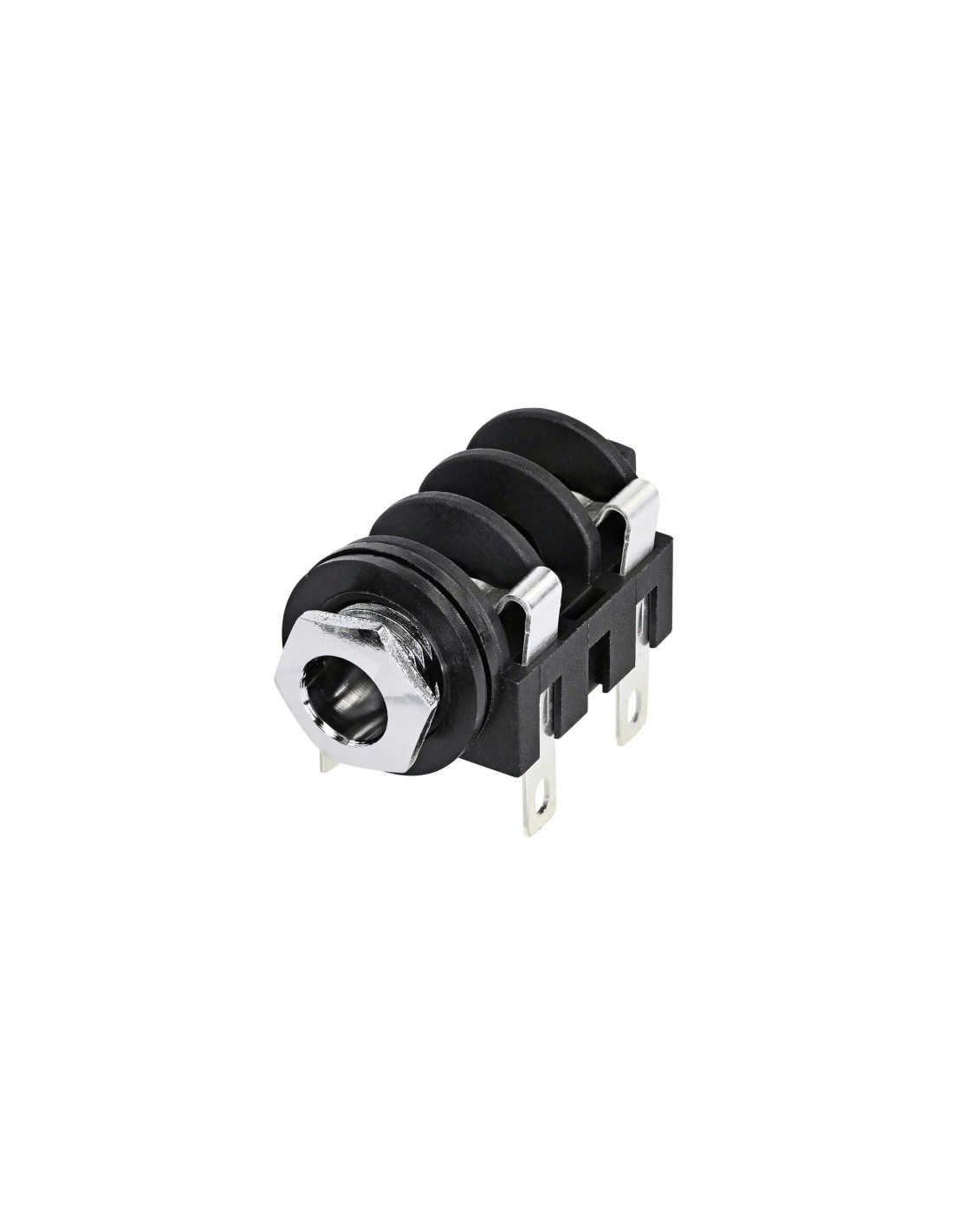 Conector de chasis jack hembra 1/4 de 2 pines. Serie: M Jacks. Color: negro, contactos en plata. Conector mono conmutable, con férula cromada y terminales de soldadura estándar. Montaje horizontal en PCB. Incluye tuerca de montaje. Compatible con todos los conectores mono de calibre A según la norma EIA RS-453. Especificaciones mecánicas: integra resorte de retención. Materiales: carcasa de poliamida. Especificaciones ambientales: norma EIA RS 453, IEC 60603-11, rango de temperatura -25 °C a +70 °C.