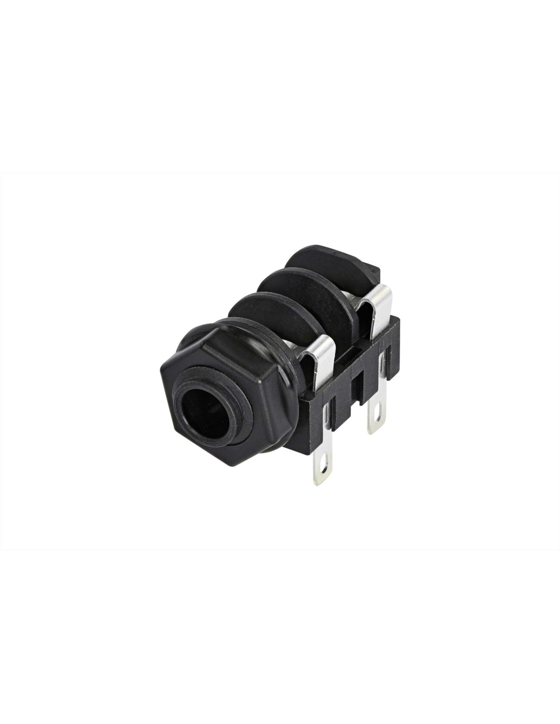 Conector de chasis jack hembra 1/4 de 2 pines. Serie: M Jacks. Color: negro, contactos en plata. Conector mono conmutable, con punta roscada completa y terminales para soldar estándar. Montaje horizontal en PCB. Incluye tuerca de montaje. Compatible con todos los conectores mono de calibre A según la norma EIA RS-453. Especificaciones mecánicas: integra resorte de retención. Materiales: carcasa de poliamida. Especificaciones ambientales: norma EIA RS 453, IEC 60603-11, rango de temperatura -25 °C a +70 °C.