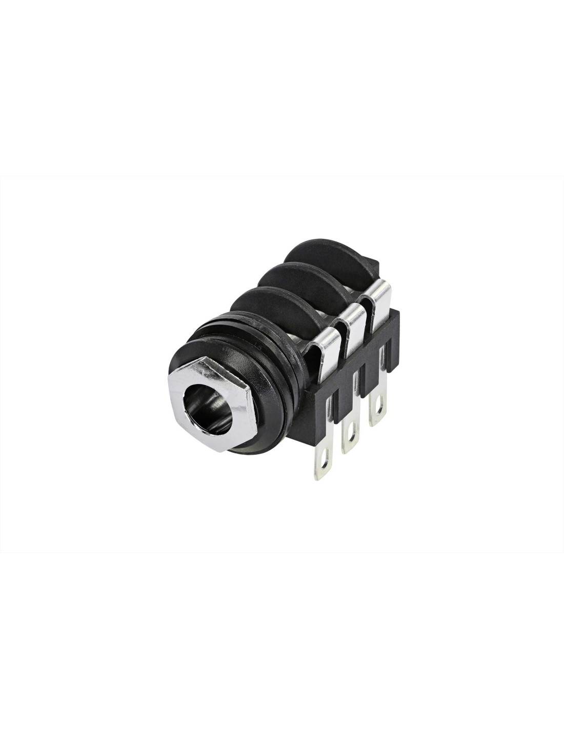 Conector de chasis jack hembra 1/4 de 3 pines. Serie: M Jacks. Color: negro, contactos en plata. Conector estéreo conmutable, con anillo cromado y terminales de soldadura estándar. Montaje horizontal en PCB. Incluye tuerca de montaje. Compatible con todos los conectores estéreo de calibre A según la norma EIA RS-453. Especificaciones mecánicas: integra resorte de retención. Materiales: carcasa de poliamida. Especificaciones ambientales: norma EIA RS 453, IEC 60603-11, rango de temperatura -25 °C a +70 °C.