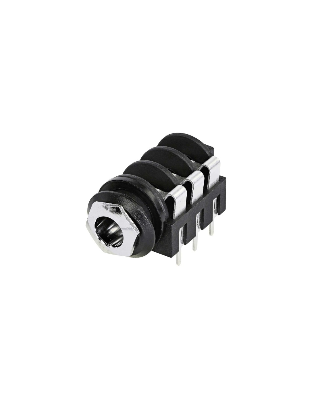 Conector de chasis jack hembra 1/4 de 3 pines. Serie: M Jacks. Color: negro, contactos en plata. Conector estéreo conmutable, con anillo cromado y pines rectos para PCB. Incluye tuerca de montaje. Compatible con todos los conectores estéreo de calibre A según la norma EIA RS-453. Especificaciones mecánicas: integra resorte de retención. Materiales: carcasa de poliamida. Especificaciones ambientales: norma EIA RS 453, IEC 60603-11, rango de temperatura -25 °C a +70 °C.