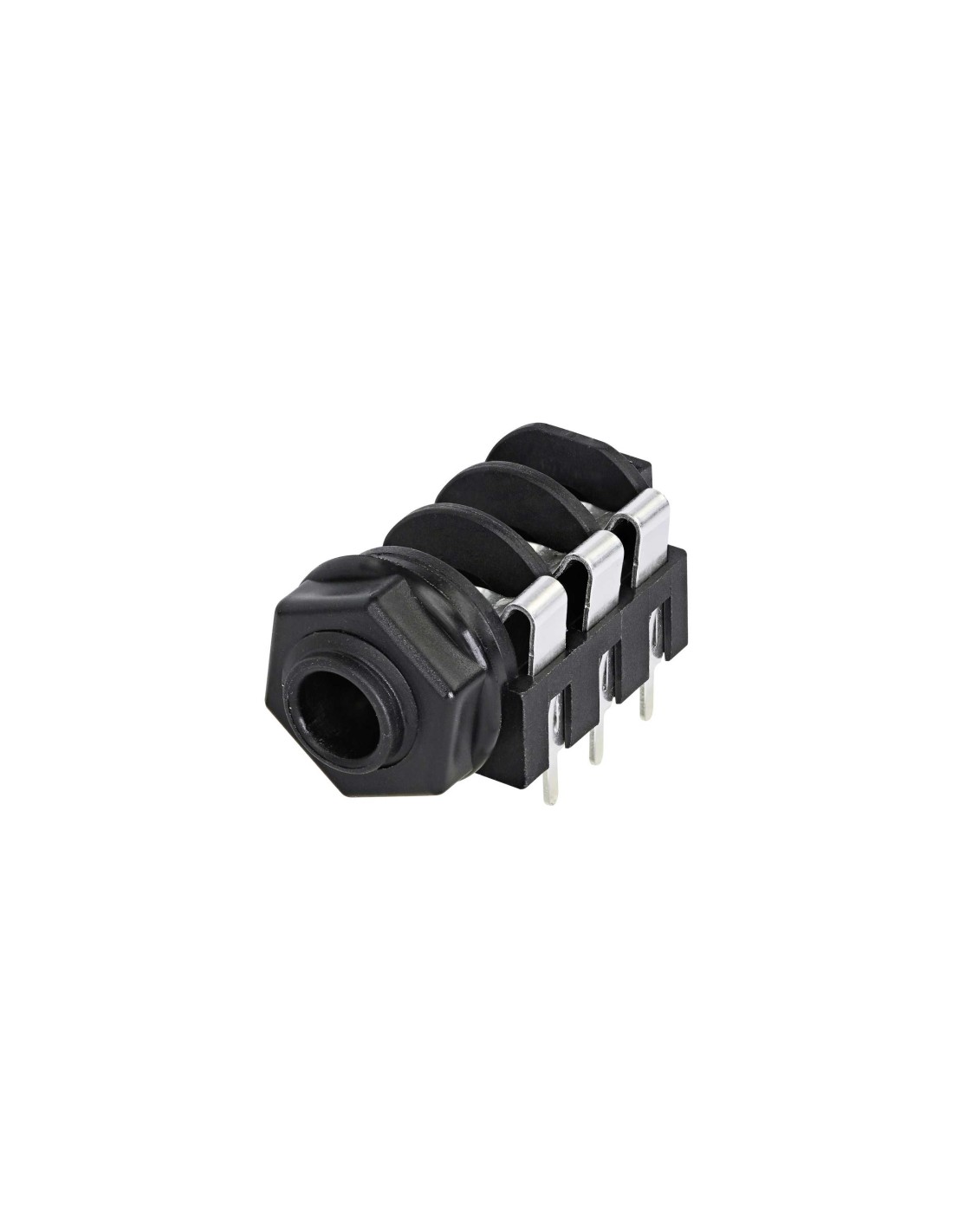 Conector de chasis jack hembra 1/4 de 3 pines. Serie: M Jacks. Color: negro, contactos en plata. Conector estéreo conmutable, con punta roscada completa y pines rectos para PCB. Montaje horizontal en PCB. Incluye tuerca de montaje. Compatible con todos los conectores estéreo de calibre A según la norma EIA RS-453. Especificaciones mecánicas: integra resorte de retención. Materiales: carcasa de poliamida. Especificaciones ambientales: norma EIA RS 453, IEC 60603-11, rango de temperatura -25 °C a +70 °C.