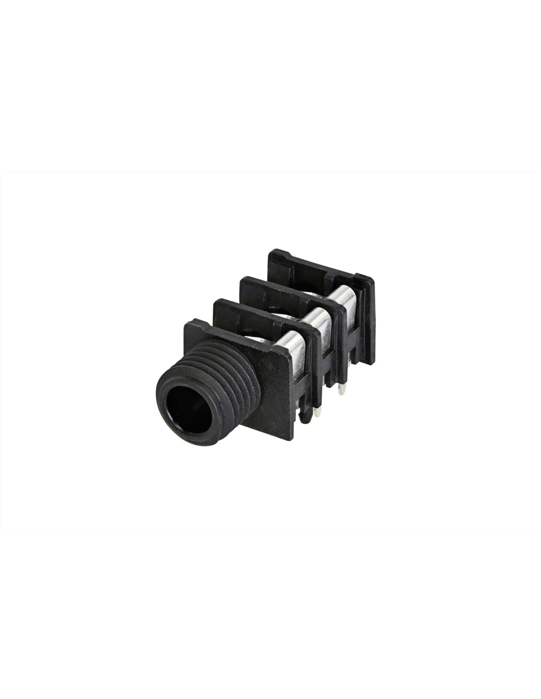 Conector de chasis jack hembra 1/4 de 3 pines. Serie: Slim Jack. Color: negro, contactos en plata. Conector estéreo no conmutable, con punta roscada completa y conexión de contacto de manga/panel frontal. Conector de montaje horizontal en panel PCB que ofrece alta densidad de empaquetado en la placa al montarse en centros mínimos de 15.88 mm (0.625 pulgadas) en filas o matrices. El hardware de montaje debe ser pedido por separado. Especificaciones mecánicas: integra muelle de retención que garantiza un agarre óptimo de las clavijas insertadas, evitando la posibilidad de pérdida de conexión. Materiales: carcasa de poliamida. Especificaciones ambientales: norma EIA RS 453, IEC 60603-11, rango de temperatura -25 °C a +70 °C.