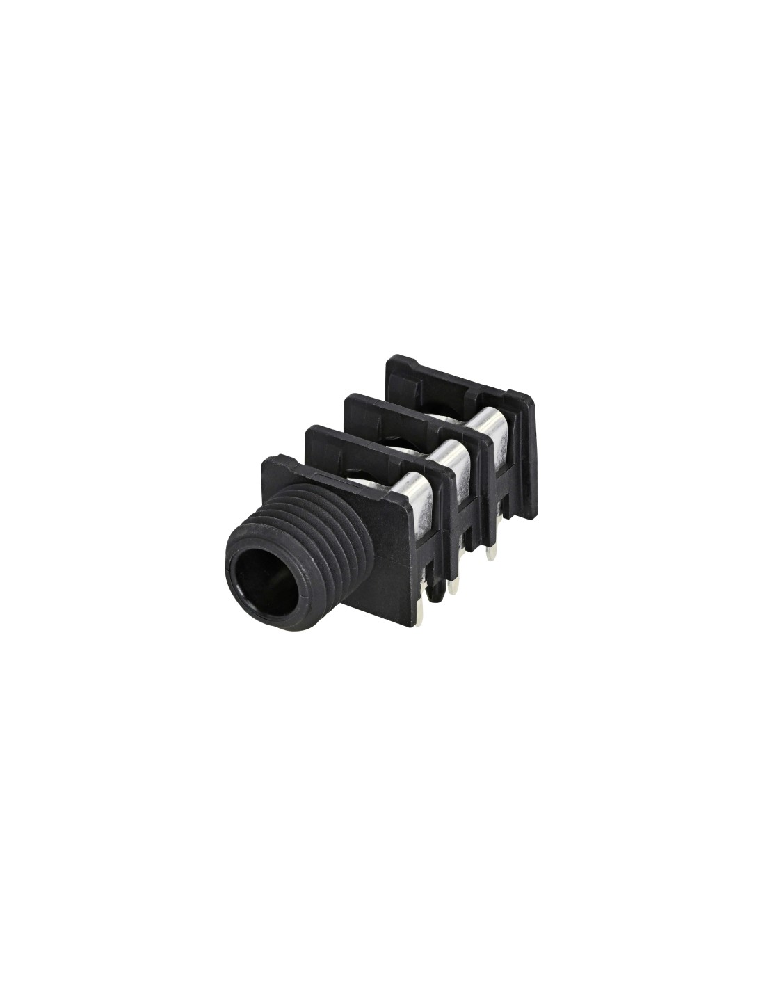 Conector de chasis jack hembra 1/4 de 3 pines. Serie: Slim Jack. Color: negro, contactos en plata. Conector estéreo conmutable, con punta roscada completa. Conector de montaje horizontal en panel PCB que ofrece alta densidad de empaquetado en la placa al montarse en centros mínimos de 15.88 mm (0.625 pulgadas) en filas o matrices. El hardware de montaje debe ser pedido por separado. Especificaciones mecánicas: integra muelle de retención que garantiza un agarre óptimo de las clavijas insertadas, evitando la posibilidad de pérdida de conexión. Materiales: carcasa de poliamida. Especificaciones ambientales: norma EIA RS 453, IEC 60603-11, rango de temperatura -25 °C a +70 °C.