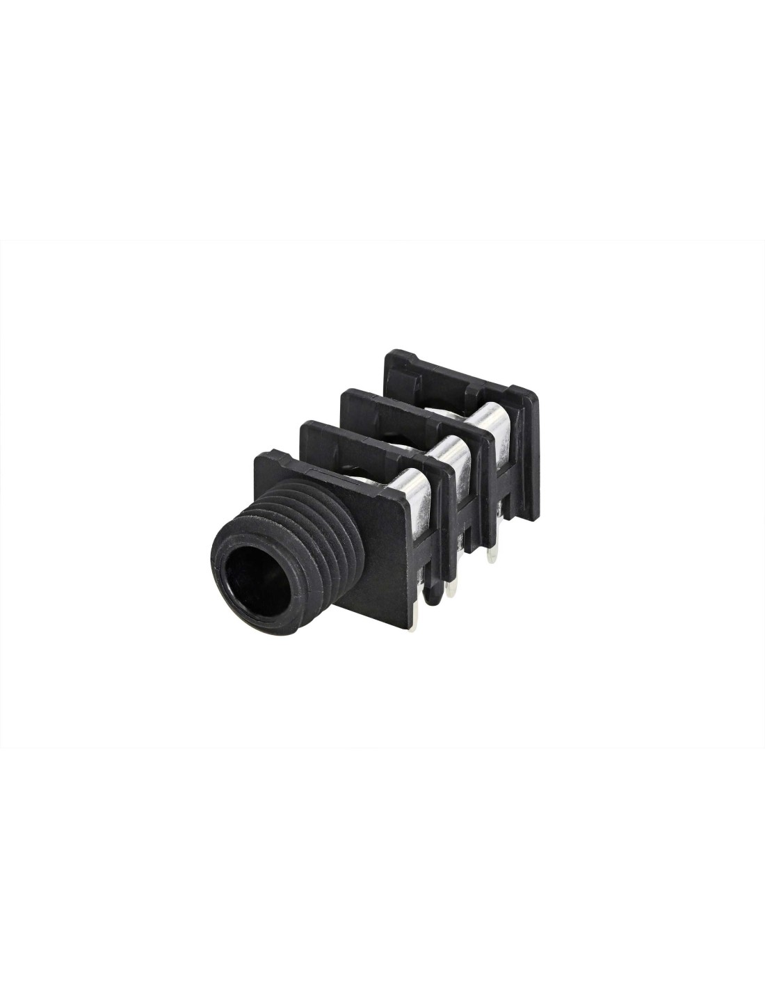 Conector de chasis jack hembra 1/4 de 3 pines. Serie: Slim Jack. Color: negro, contactos en plata. Conector estéreo conmutable, con punta roscada completa y conexión de contacto de manga/panel frontal. Conector de montaje horizontal en panel PCB que ofrece alta densidad de empaquetado en la placa al montarse en centros mínimos de 15.88 mm (0.625 pulgadas) en filas o matrices. El hardware de montaje debe ser pedido por separado. Especificaciones mecánicas: integra muelle de retención que garantiza un agarre óptimo de las clavijas insertadas, evitando la posibilidad de pérdida de conexión. Materiales: carcasa de poliamida. Especificaciones ambientales: norma EIA RS 453, IEC 60603-11, rango de temperatura -25 °C a +70 °C.