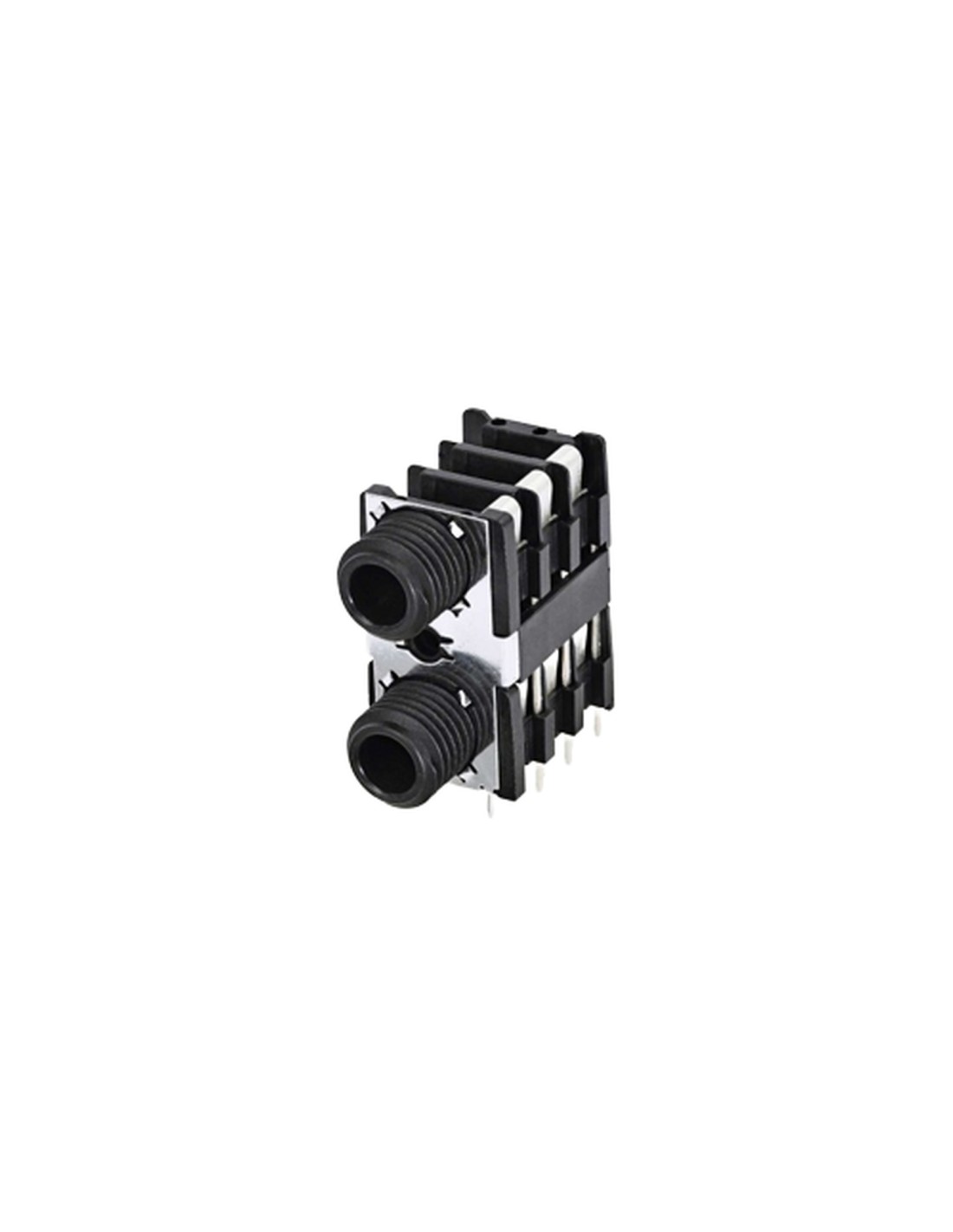 Conector de chasis jack hembra 1/4 dual estéreo. Serie: Stacking Jack. Color: negro, contactos en plata. Punta completa. Conector de montaje horizontal en panel PCB con contactos de conmutación. El jack apilable de 1/4 presenta la mayor densidad de empaquetado en placa, ya que dos jacks ocupan una sola ranura y se ajustan en una unidad de rack. Especificaciones mecánicas: integra muelle de retención. Materiales: carcasa de poliamida. Especificaciones ambientales: norma EIA RS 453, IEC 60603-11, rango de temperatura -25 °C a +70 °C.