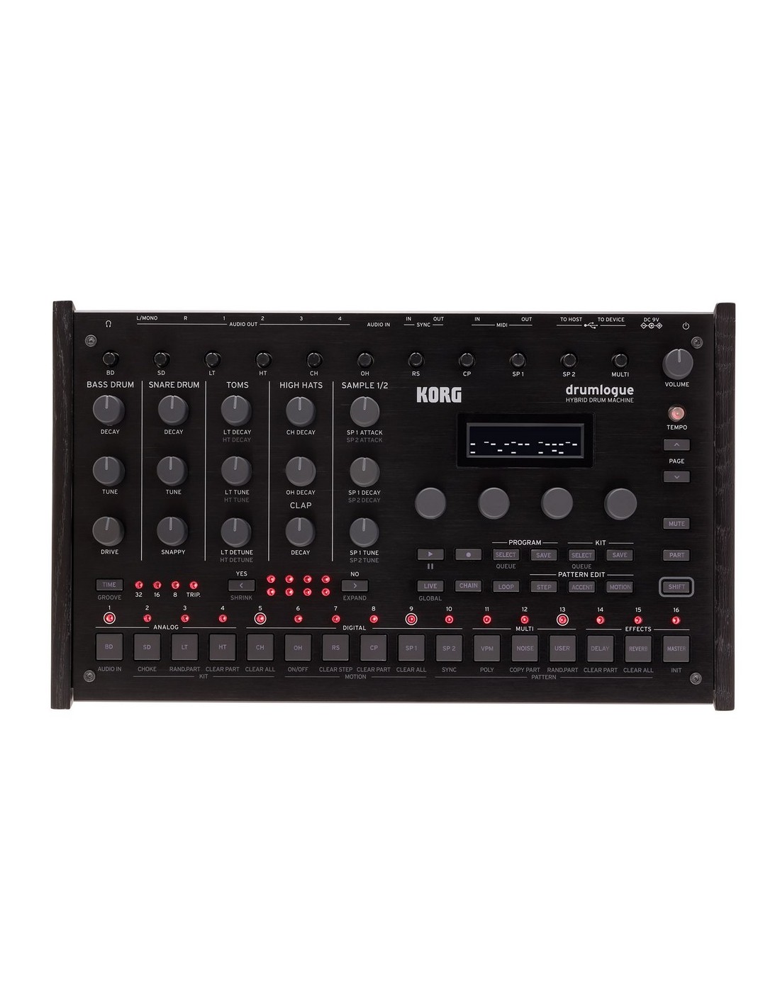 CAJA DE RITMOS Drumlogue es una nueva caja de ritmos híbrida con 4 partes analógicas (voces) y 7 partes digitales (voces) que ofrecen sonidos extraordinariamente ricos, potentes y emocionantes con posibilidades rítmicas sin precedentes. El motor de sonido es extremadamente flexible y la arquitectura abierta permite a los usuarios cambiar fácilmente las muestras digitales, o utilizar osciladores y efectos personalizados utilizando la nueva plataforma logueSDK. El puerto USB permite el uso de controladores MIDI compatibles como nanoPad2 o microKEY (incluyendo la información de velocidad MIDI) lo que permite tocar el drumlogue en tiempo real. La interfaz de usuario es sencilla e intuitiva para que la creación de nuevos sonidos sea fácil y divertido. Además de su salida principal L/R, otras 4 salidas paralelas proporcionan aún más libertad, convirtiendo a drumlogue en una caja de ritmos realmente versátil y potente.Características destacadas:-Polifonía máxima: 11 voces-Motor de sonido: analógico x 4, PCM / muestras de usuario x 6, Multi-Engine (NOISE, VPM, sintetizador de usuario) x 1-Muestras de batería: 256 (128 presets de fábrica)-Kits de batería: 256 (128 presets de fábrica)-Patrones rítmicos: 256 (128 presets de fábrica)-Efectos: Reverb, Delay, Master-Conexiones: auriculares, salidas L/MONO - R, AUDIO OUT 1-4, Sync IN/OUT, AUDIO IN, MIDI IN/OUT, USB A (a dispositivo, solo para controladores MIDI, USB B (to host)